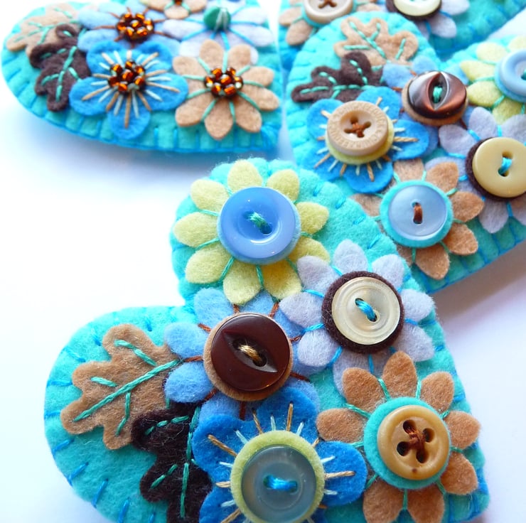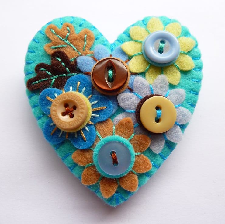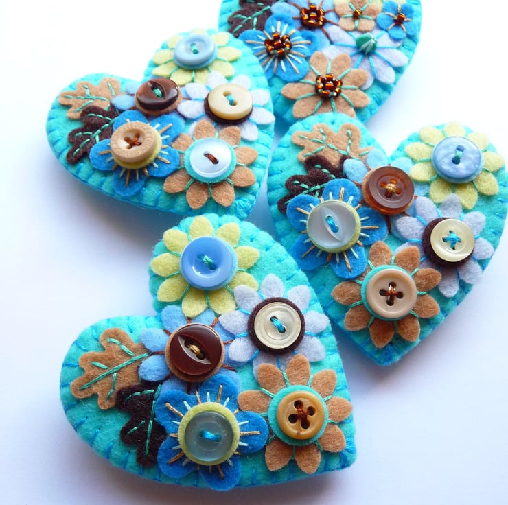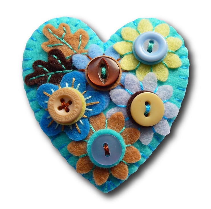 Japanese Art Inspired Heart Shape Felt Brooch - Turquoise