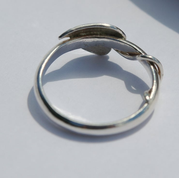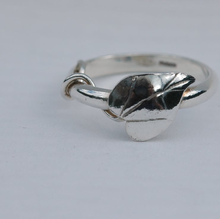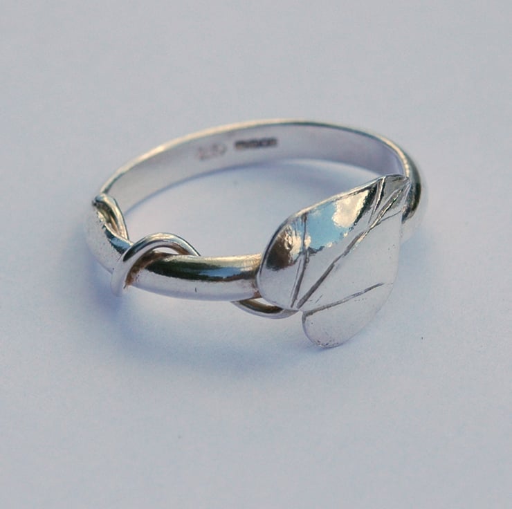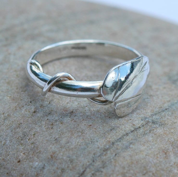 A gorgeous sterling silver ring that makes a lovely gift or a special treat for yourself. I created the ring from sterling silver D-wire, 3.2mm wide, giving it a very sturdy feel. The heart shaped leaf has been cut from sterling silver sheet, engraved with veins and soldered to the ring along with a delicate tendril that winds around it. The ring has been Hallmarked by the London Assay Office and tumble-polished to a high shine which reflects the light brilliantly. It weighs 3.8g. The size of the ring currently available is R, which is most likely to fit a lady's middle finger or a sturdy ring finger. I can make other sizes to order if you allow about two weeks.