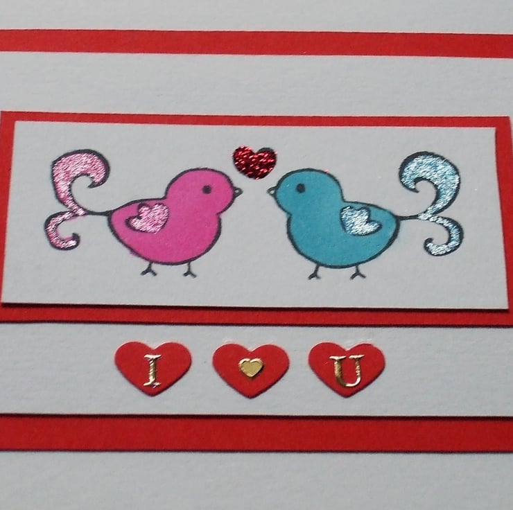 The birds have been hand-stamped then coloured with alcohol inks, I've used matching glitter markers to highlight the wings and tails of the birds and red glitter on the heart. I've used simple layers or red and white in varying widths to frame the image and added red faux gems to the corners. 3 red hearts with gold letters spell out the 'I love U' message.