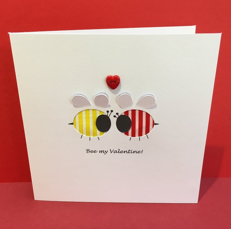 The little bees have been hand cut and striped ribbon has been stuck behind with the message 'Bee my Valentine!'. Little wings have been carefully cut out of the card and folded out. A cute and funny card for Valentine's day!