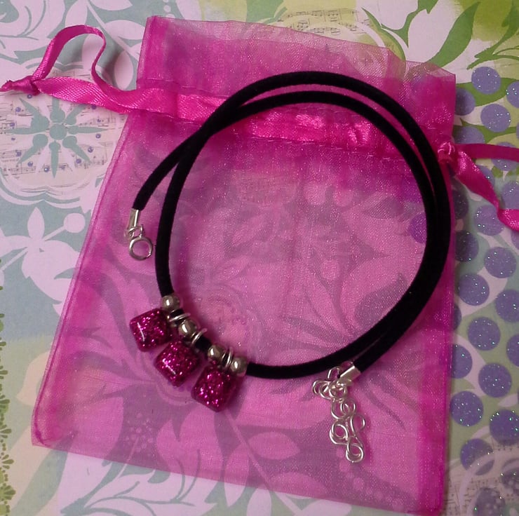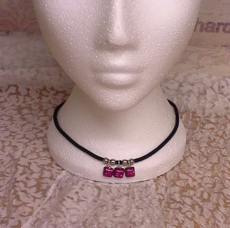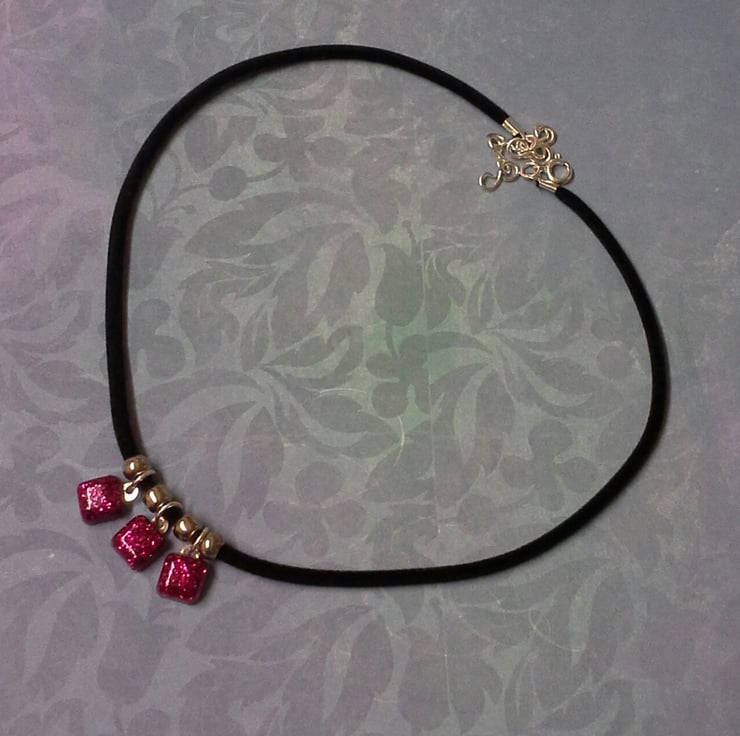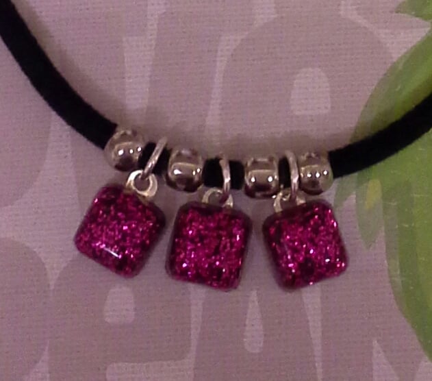 I have made this pretty little necklace using three sparkling resin squares. They have been hung on a silky soft velour coated braid with silver coloured spacer beads in between each square.