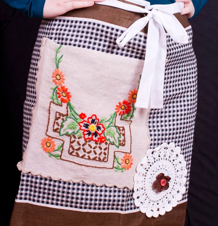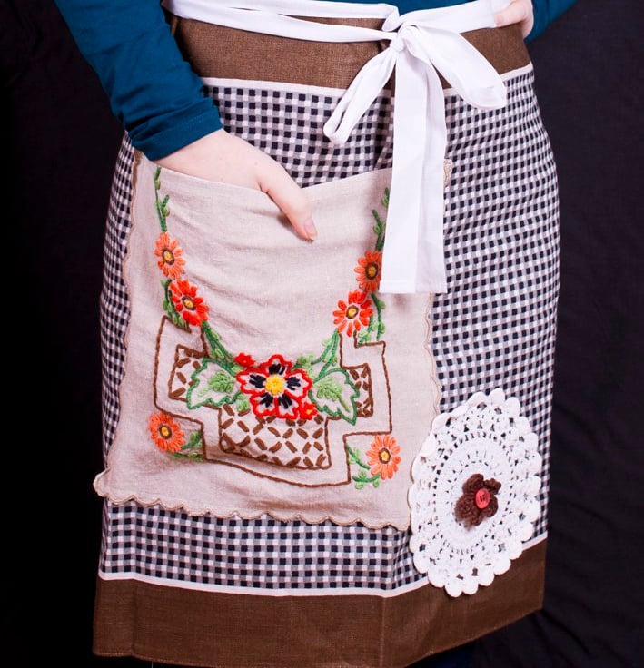Feel like a domestic goddess in this upcycled half apron. Fashioned from a tea towel with a dark brown (almost black) gingham style print, this useful apron features a roomy pocket made from a beautiful vintage embroidered traycloth and is decorated with a small vintage crochet doily and a tiny crochet flower and button. The ties are left lovely and long so they can be wrapped around and tied in front barista-style as shown, but could easily be shortened if required.
