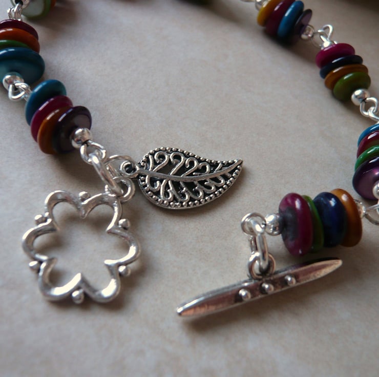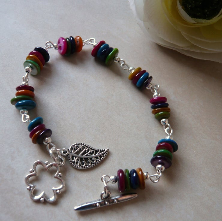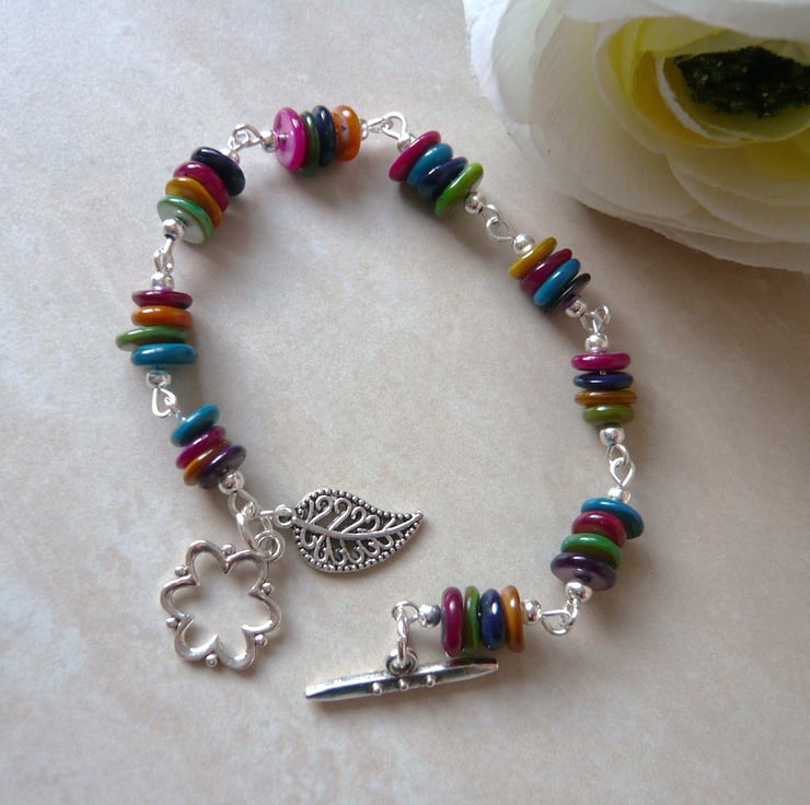 This bracelet has links made from four different coloured rounded chip shell beads with small silver plated spcer beads as an accent.
