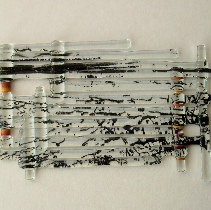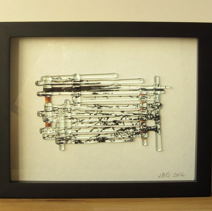This is one of a series of glass and stitch landscapes inspired by my local beach and shoreline. I fuse the strips of glass together in my kiln, printing the scene with glass enamel. Once it is fired I add further detail with stitch. This glass piece is stitched to an off-white background and framed in a black box frame which highlights the printed glass nicely