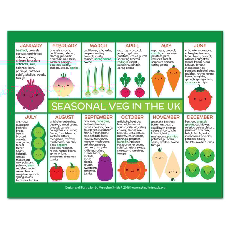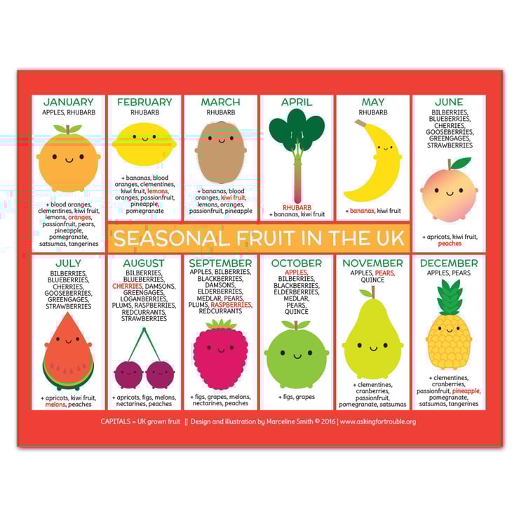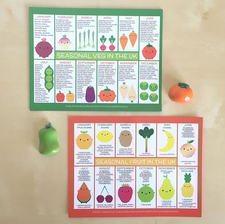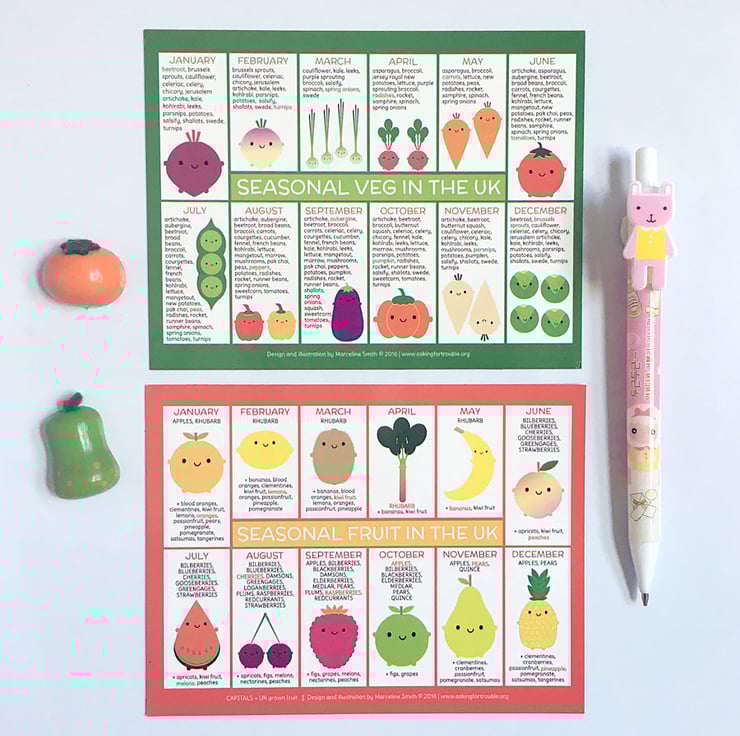 Eating seasonally is great for many reasons - you can buy locally grown produce instead of having it flown in from the other side of the globe and it's often fresher, cheaper and more nutritious. To help you see what's in season, I've made these handy charts, illustrated with kawaii fruits and vegetables. You'll be able to plan ahead when you're looking up recipes or doing the weekly shop.