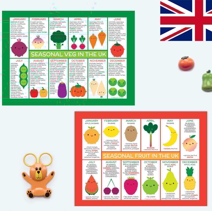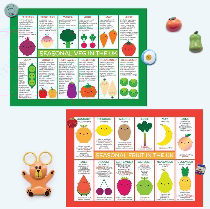 To help you see what's in season, I've made these handy charts, illustrated with kawaii fruits and vegetables. Stick them on your fridge and you'll be able to plan ahead when you're looking up recipes or doing the weekly shop to help you eat with the seasons.