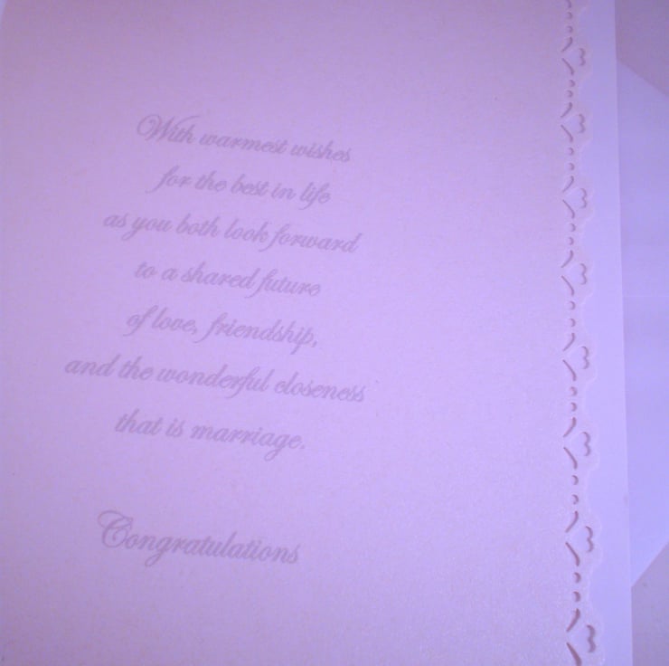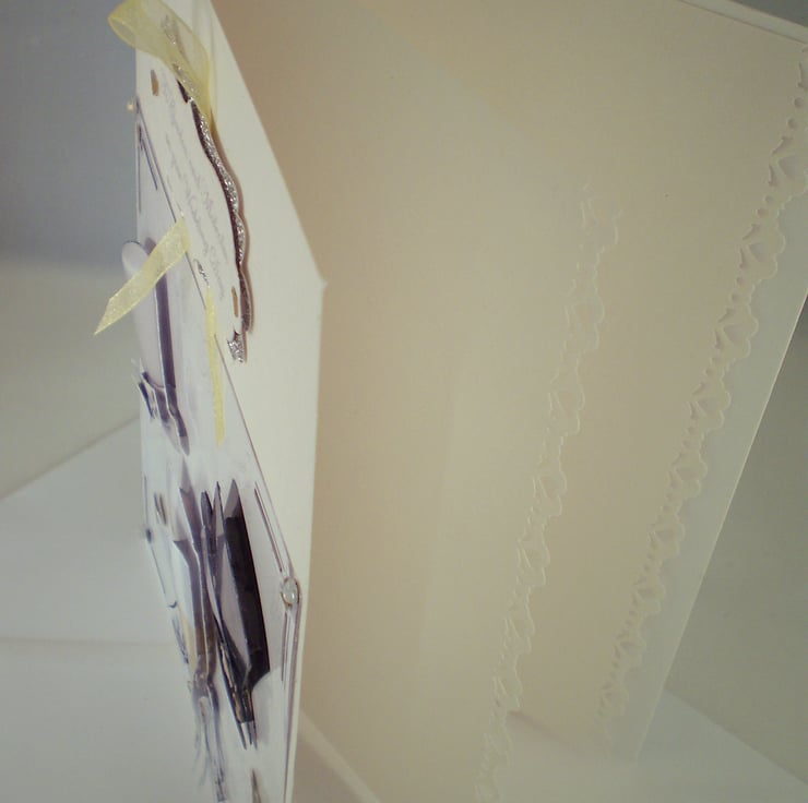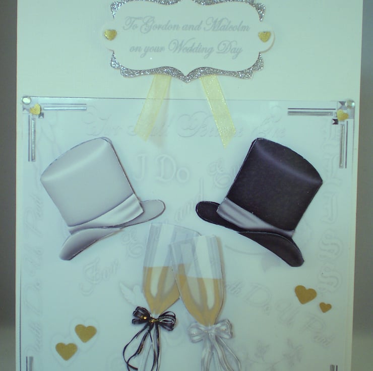 A white card measuring 150x210mm(6x8in) featuring two top hats,champagne and wedding rings which are 3D/decoupage. I have used photograph paper which gives the card a nice glossy look.