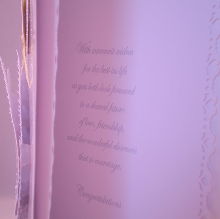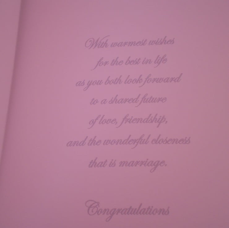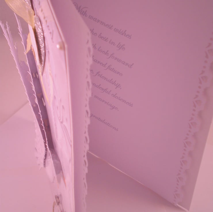 A white card measuring 150x210mm(6x8in) featuring a white dove and wedding rings I have used photograph paper which gives the card a nice glossy look.