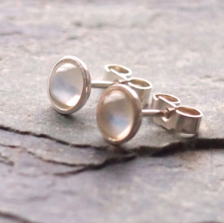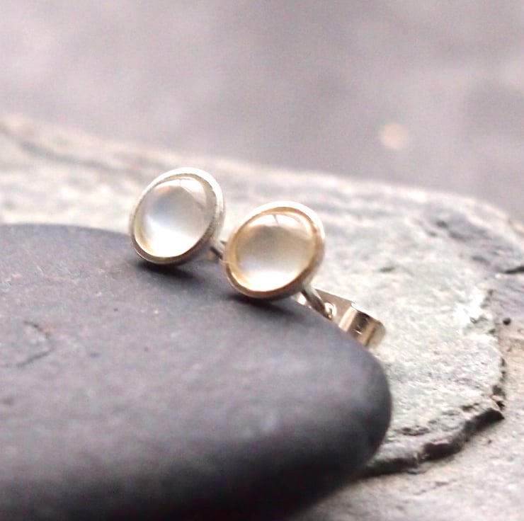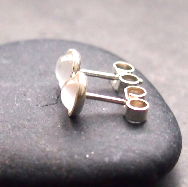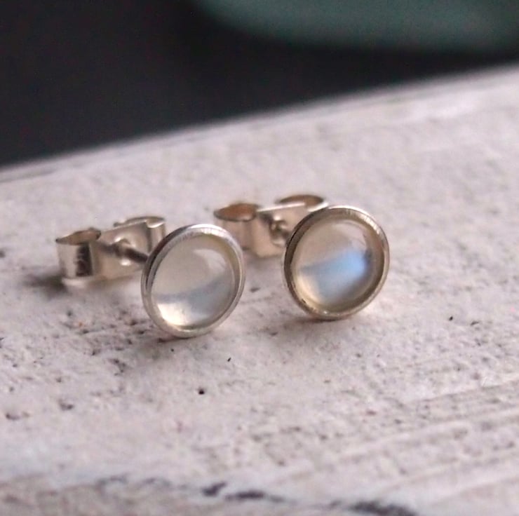 Gorgeous blue flash moonstone cabachons are mounted on a sterling silver setting with a stud.