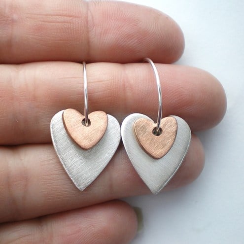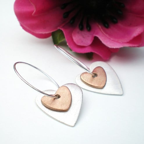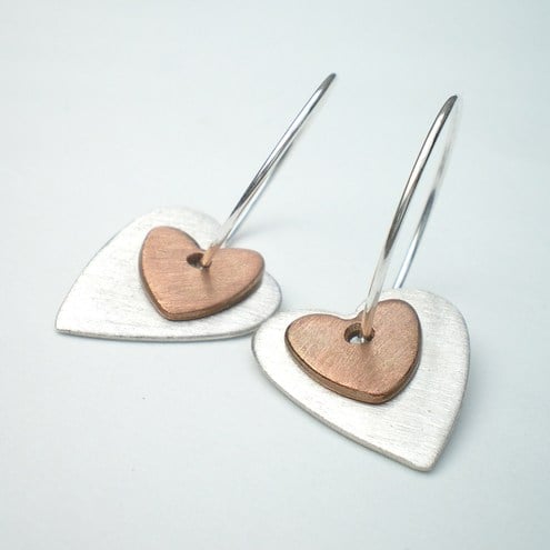 Silver and copper heart earrings, made out of recycled silver and copper they make a great eco friendly choice!