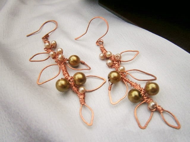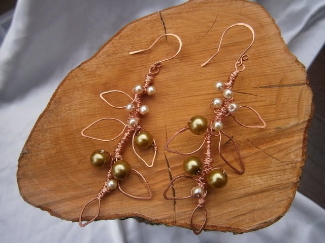 Copper wire earrings. Delicate free formed wire leaves, embellished with cream and olive pearls, on hand forged copper ear wires. Very Boho!
