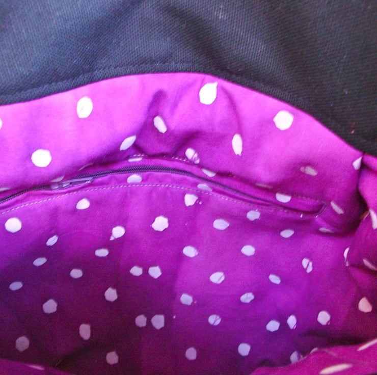 Bag is fully lined in a purple polkadot batik cotton fabric , and has a handy zip pocket.