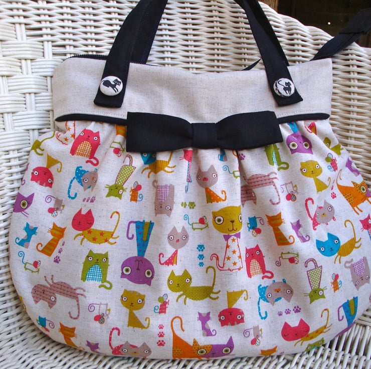A beautiful handmade handbag , made in a cotton linen fabric , featuring printed funky cats.