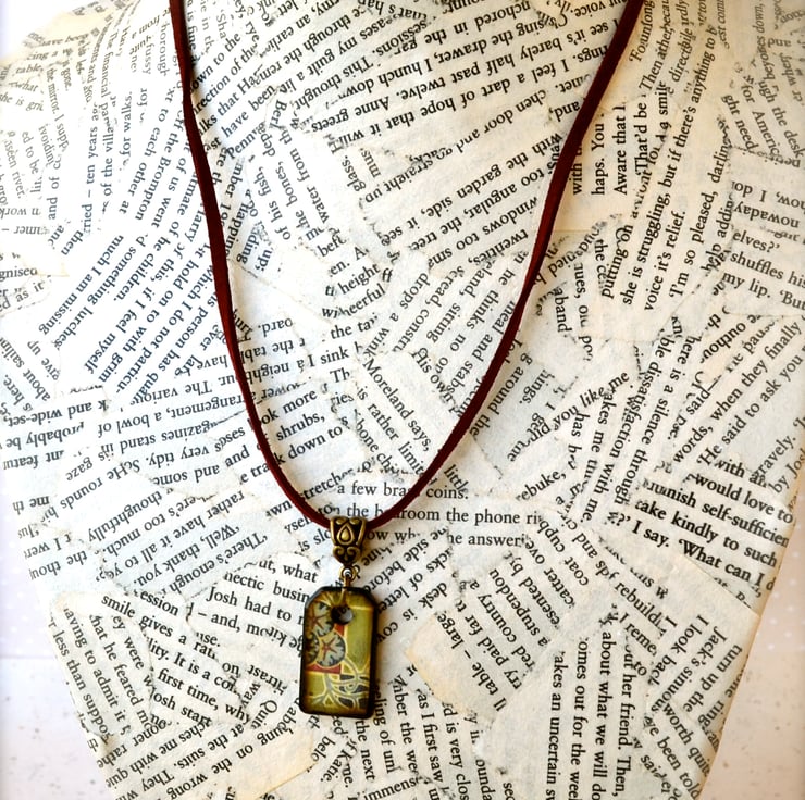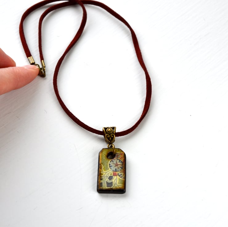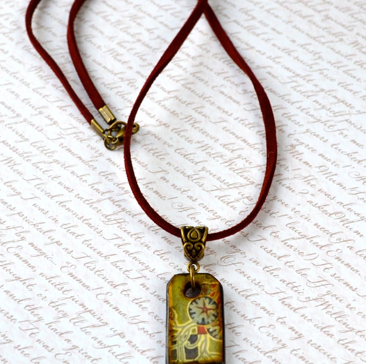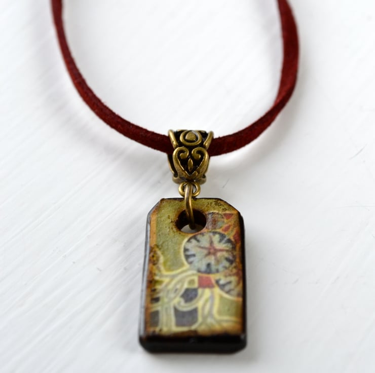 This lovely little pendant features a one of a kind handmade wooden tile bead, decorated with a gorgeous abstract pattern in green, red and brown.