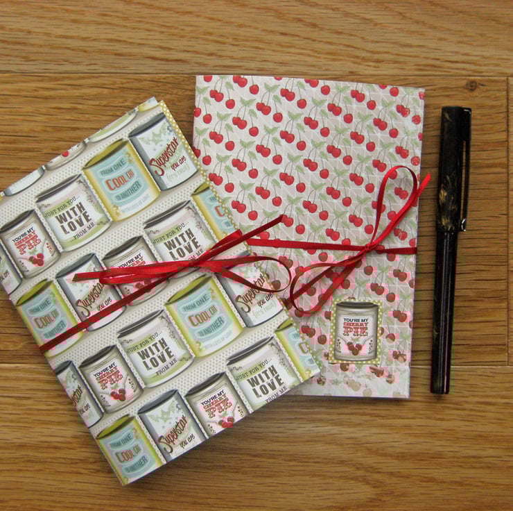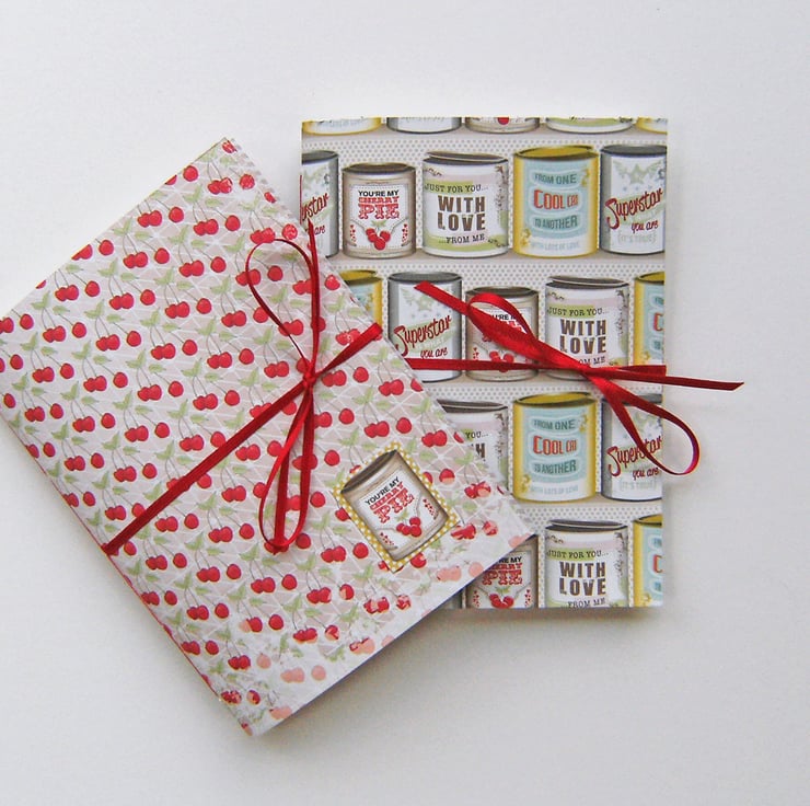The books are covered with papers from the "Happy Days" range by Papermania. One has a design of tins with sweet messages on their labels; the other has bunches of cheerful red cherries and is embellished with a matching "You're my Cherry Pie" can, on a green background. The papers are double-sided, so there is a pattern on the inside of each cover.
