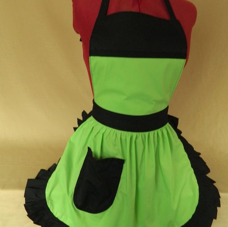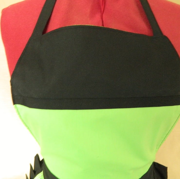 Here we have a lovely polycotton lime green with black trim retro style apron, handmade in house to our own design. (see photos). Adjustable neck and waist ties so will fit up to a size 22.