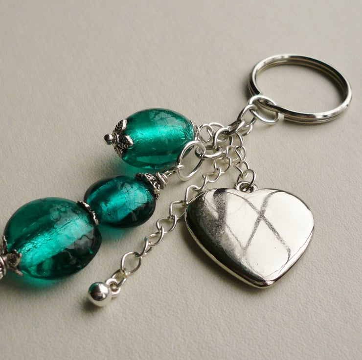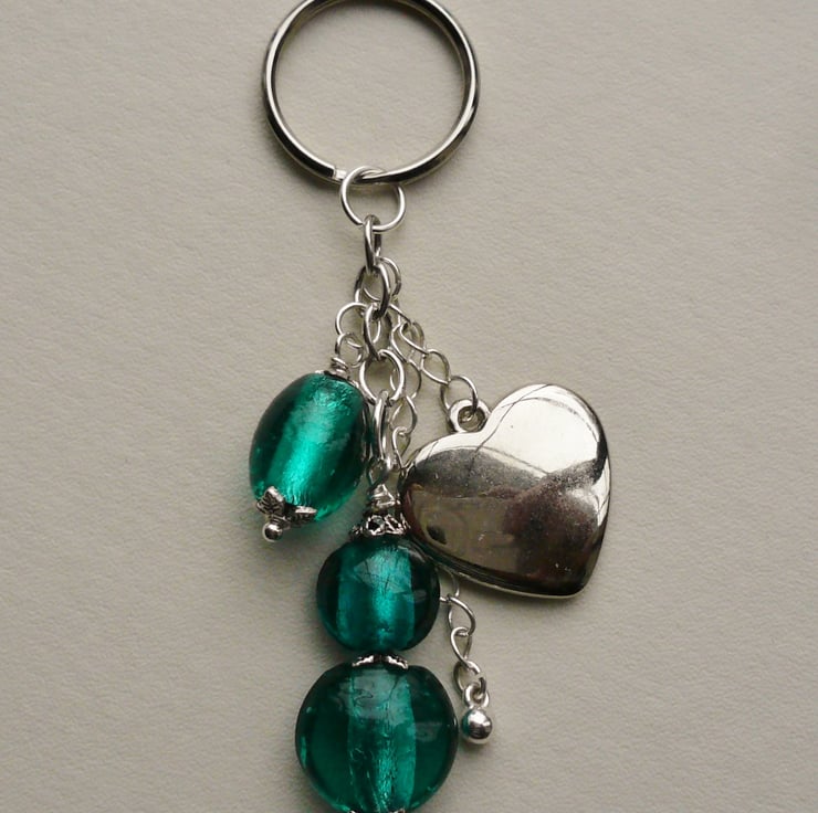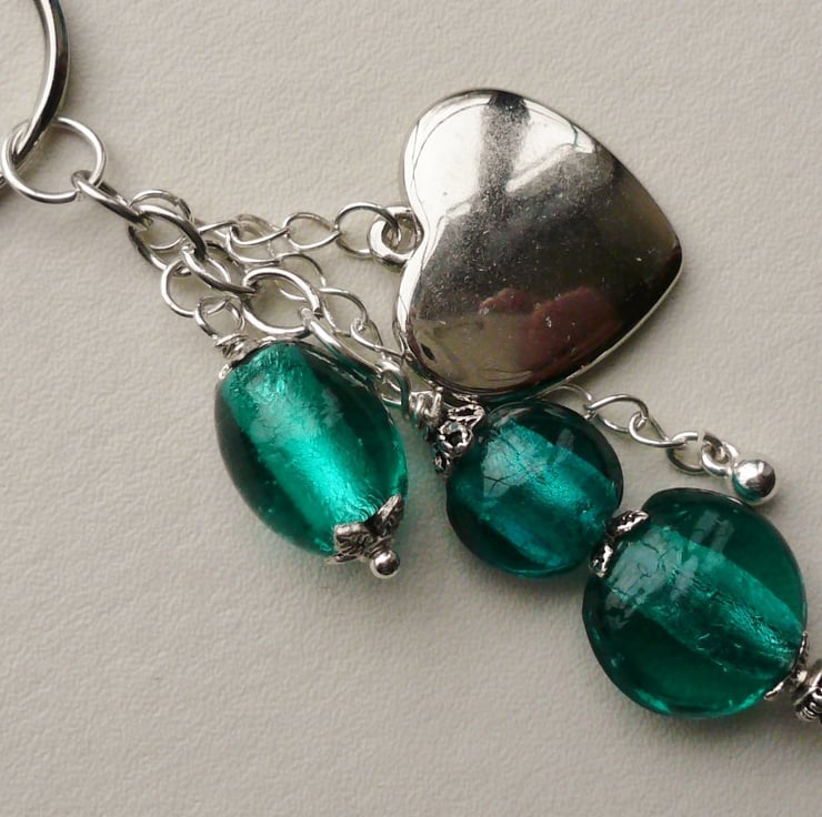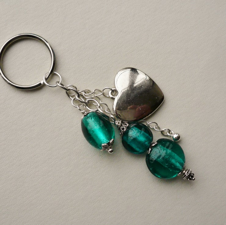This key ring is made up of three different foil-lined glass beads in a lovely deep teal blue colour; together with silver plated bead caps and a 22mm wide metalised silver acrylic flat heart charm. All attached to a silver plated 25mm ring and chain.