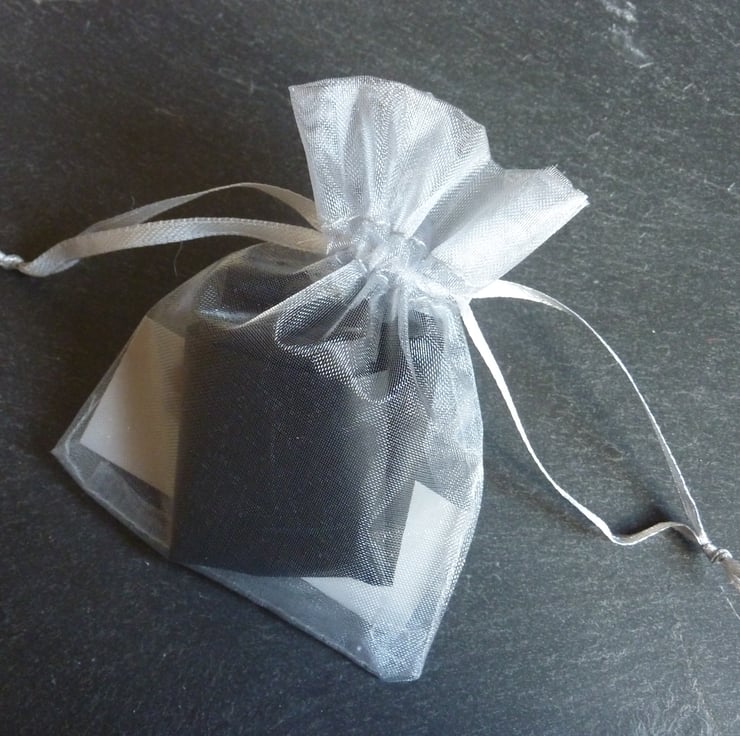Packaging: Wrapped in tissue in a silver organza gift bag