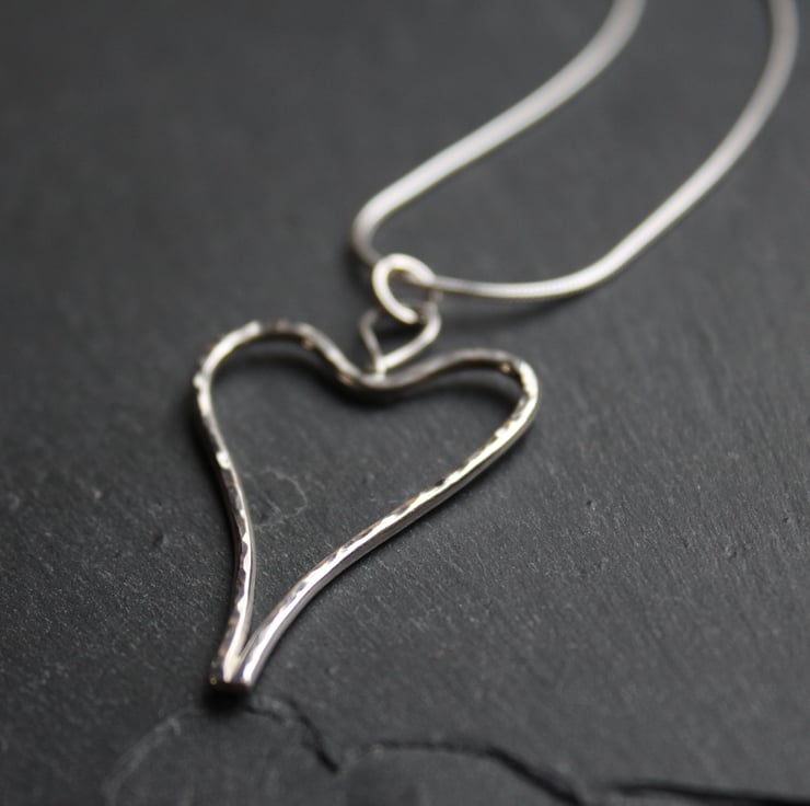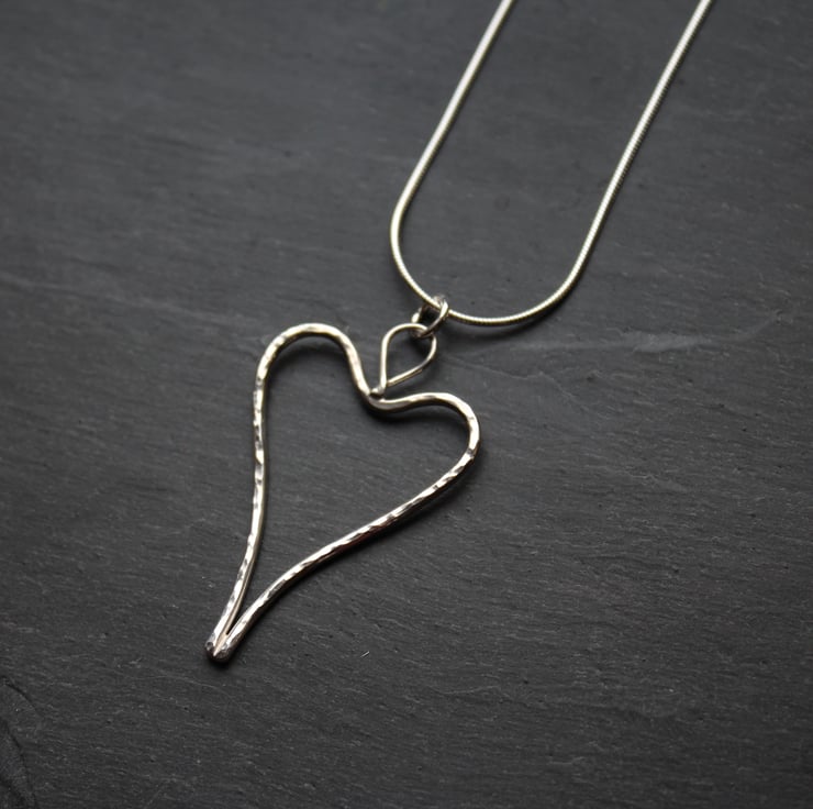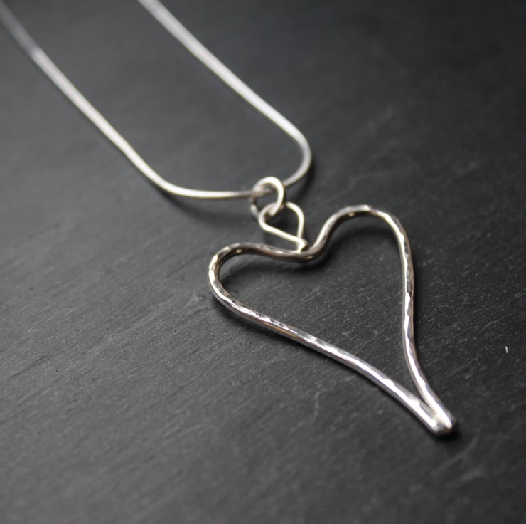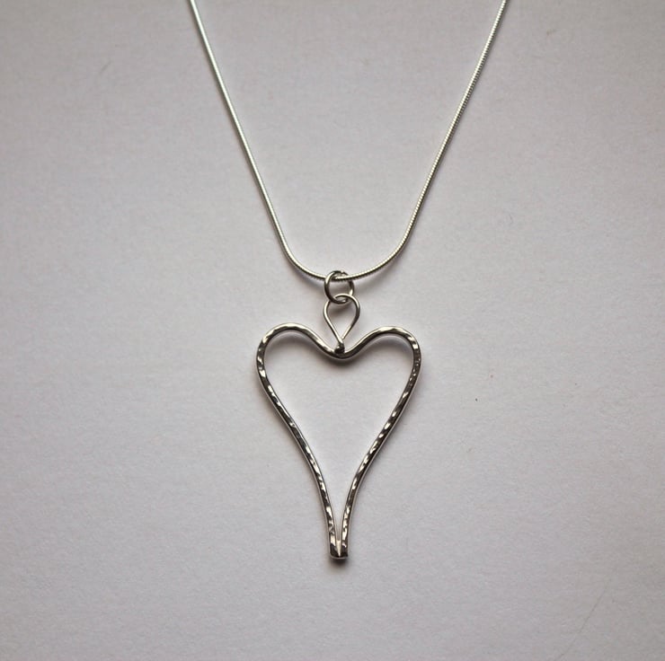 This pretty heart pendant has been created from 1.5mm round wire and lightly hammered to reflect the light. It comes with a 16"/40cm sterling silver snake chain. If you would prefer an 18"/45cm chain please message me when ordering.
