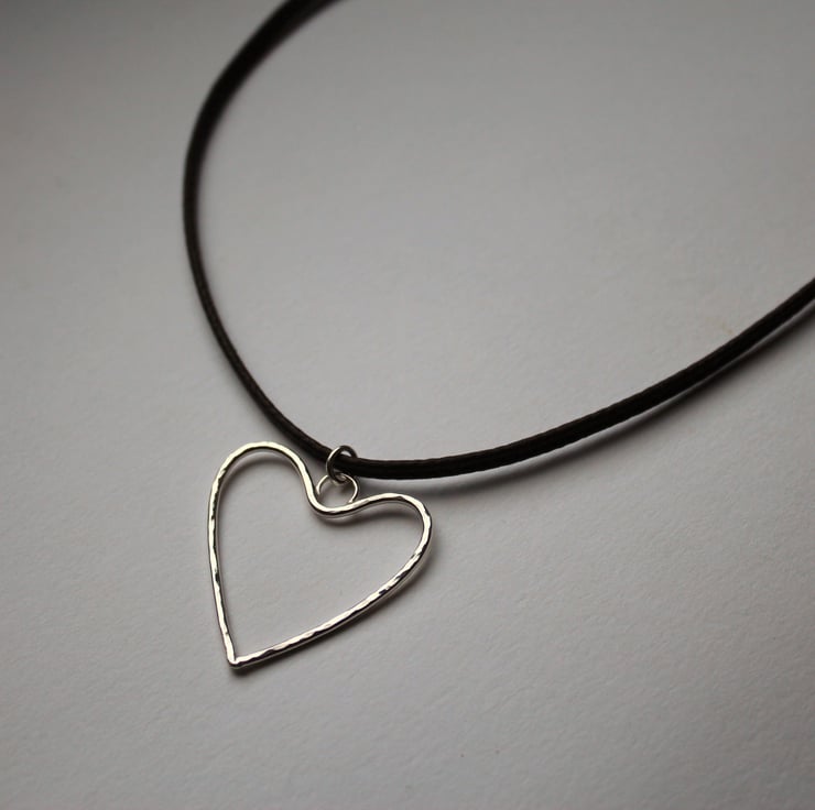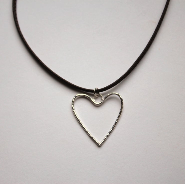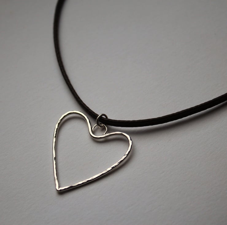 Hammered sterling silver wire heart pendant polished to a high shine - a lovely sparkly gift for someone special, or a treat for yourself! Presented on a 17"/42cm brown leather necklet with sterling silver clasp.