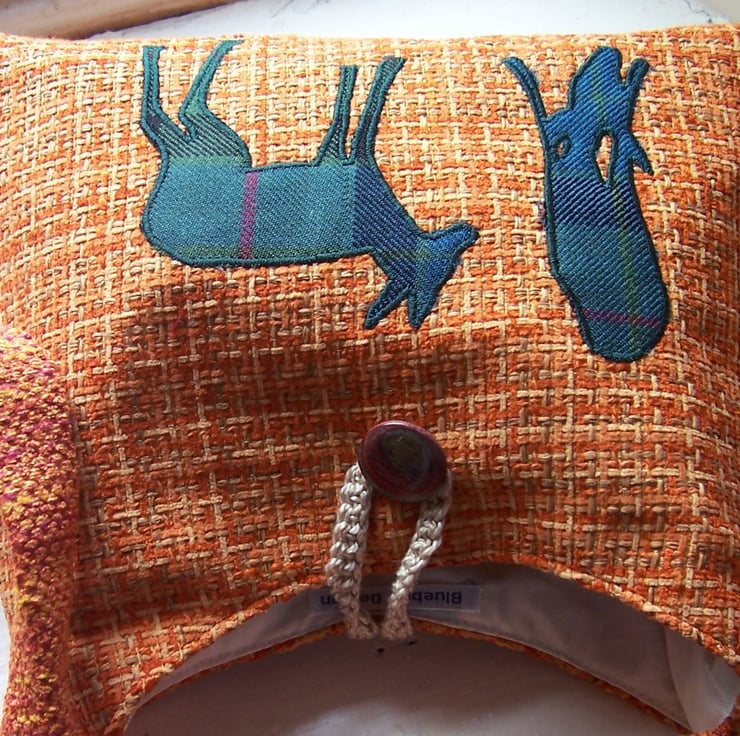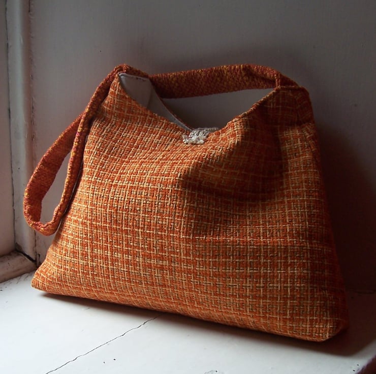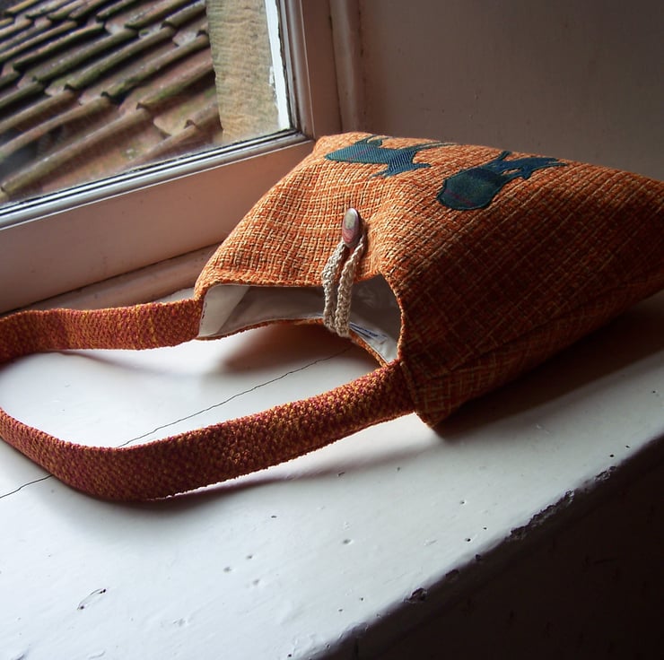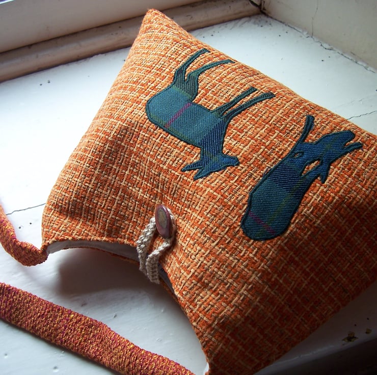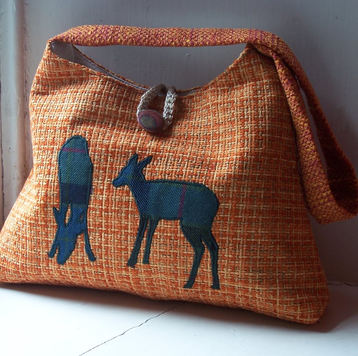 Orange and beige tweedy textured furnishing fabric, with a different, co-ordinating, fabric for the strap. Appliqued and machine embroidered deer in wool tartan embellish the front. Bag fastens with a crochet chain loop and a dyed wooden button.
