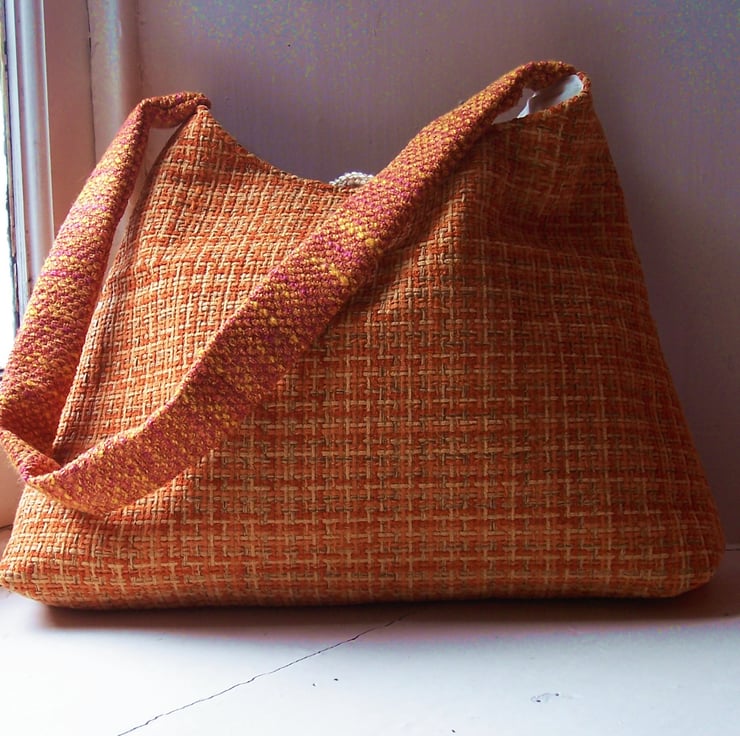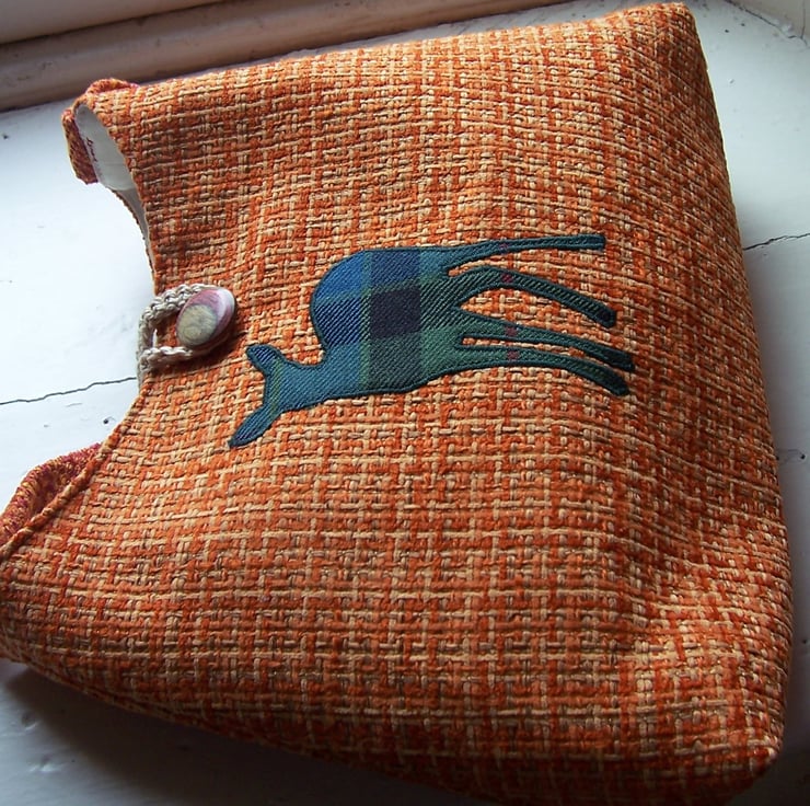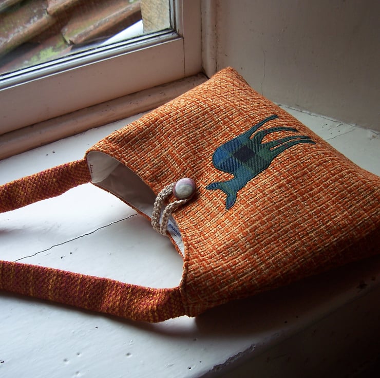 Orange and beige tweedy textured furnishing fabric, with a different, co-ordinating, fabric for the strap. Appliqued and machine embroidered deer in wool tartan embellishes the front. Bag fastens with a crochet chain loop and a dyed wooden button.