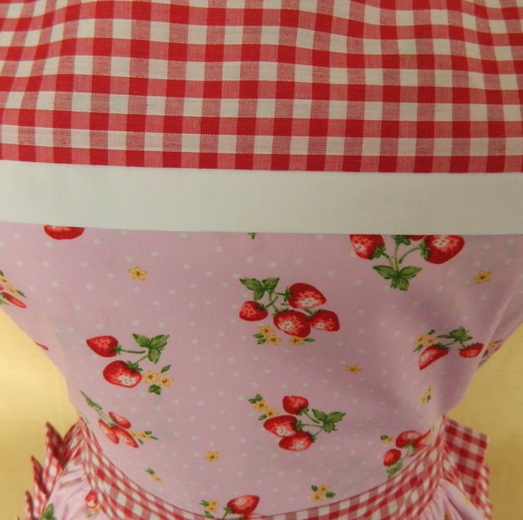 Here we have a lovely cotton rich pink and white polka dot with strawberries and red check trim retro style apron, handmade in house to our own design. (see photos). Adjustable neck and waist ties so will fit up to a size 22.