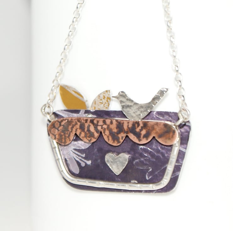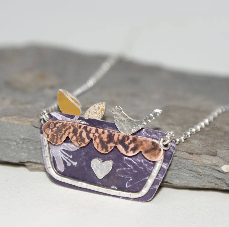 A quirky colourful pendant that's part of my in the garden range. The textured background has been cut from hand painted aluminium and riveted to the silver framework. The front is made from sterling silver and copper and features a little textured silver bird and a tiny heart. This is then hung from a sterling silver chain.