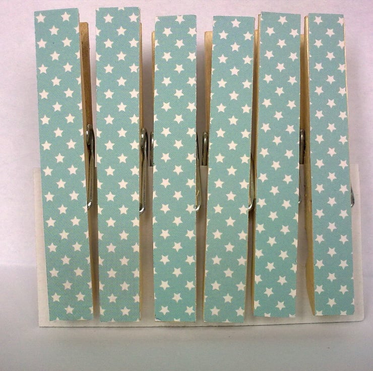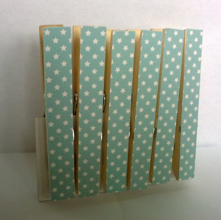 Decoupaged with Tilda paper, these sets of 6 pegs are just the thing to add a touch of style to your fridge and organise your lists, letters, coupons and reminders. Also make a great gift!. Exact pattern placement may vary slightly between sets.