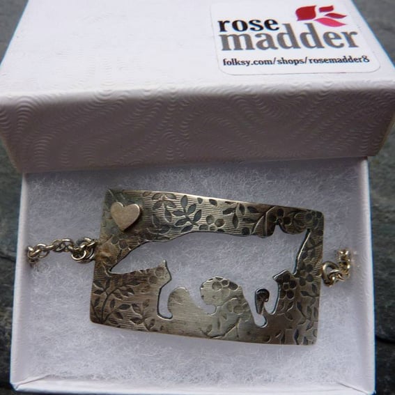 The bracelet features a silhoutte of a fox on a floral textured silver tag which has been oxidised and shined to reveal the beauty of the metal. A tiny heart adorns the tag. The fox outline looks particularly striking against dark material, 'framing' the clothing.