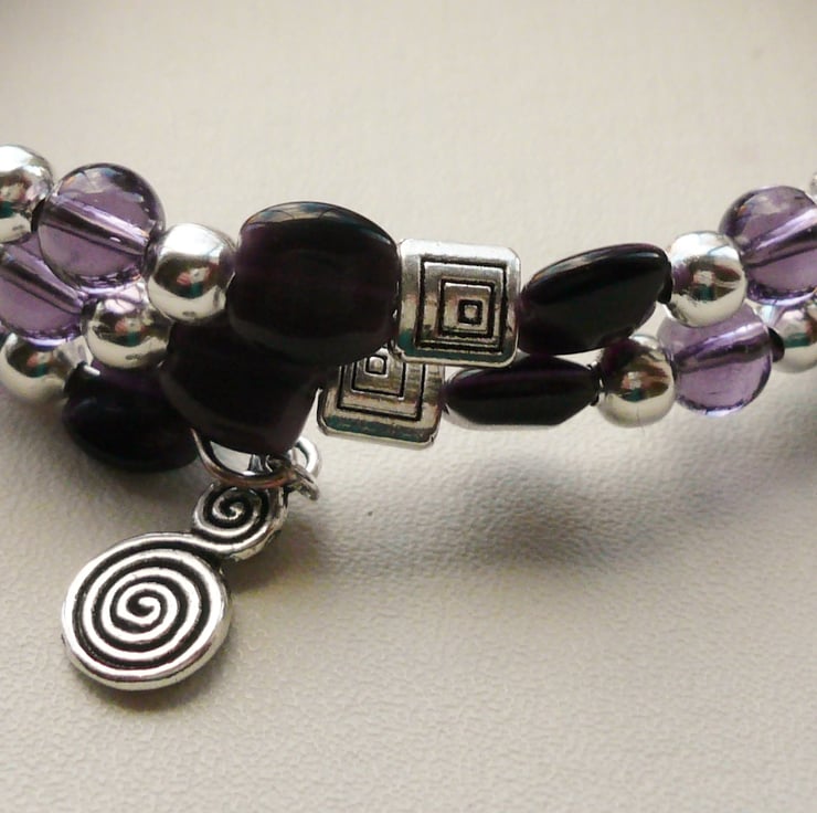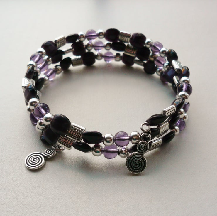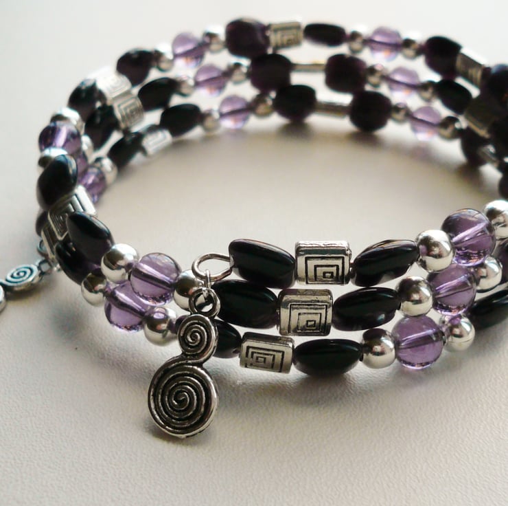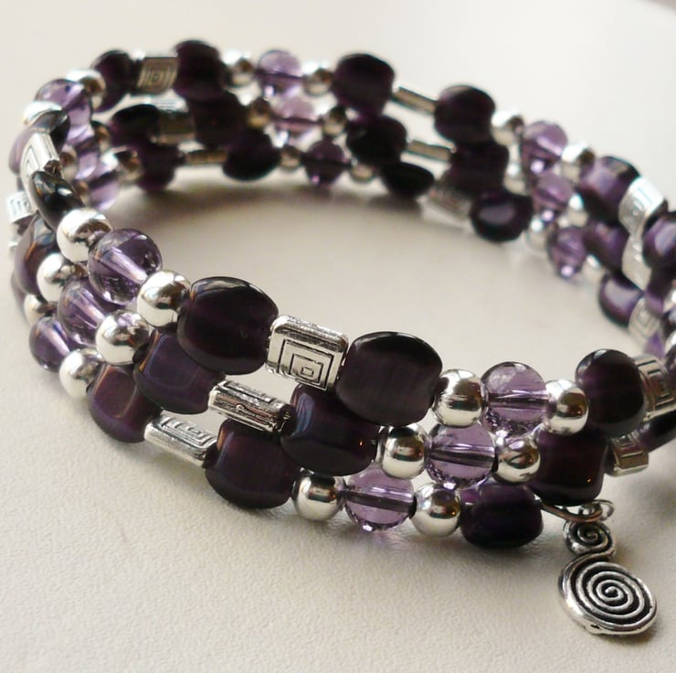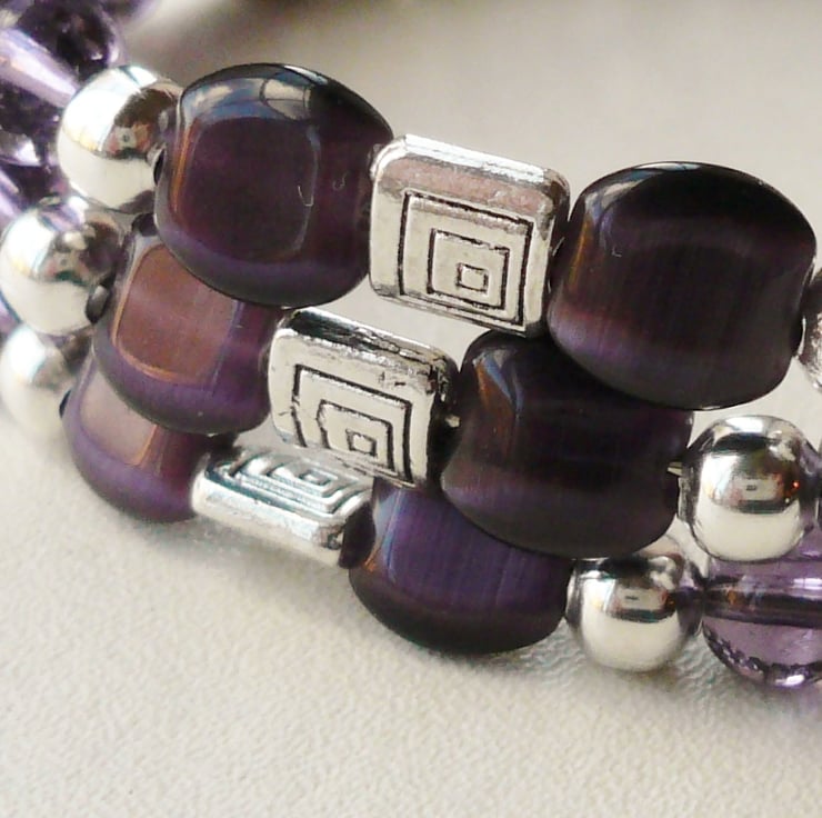 This bracelet is made up of 7mm flat square dark purple glass cat's eye beads, 6mm clear purple glass round beads with 6mm Tibetan silver round and flat square spacer beads. These have all been threaded onto three coils of silver plated memory wire and finished off with a15mm swirl charm on each end.