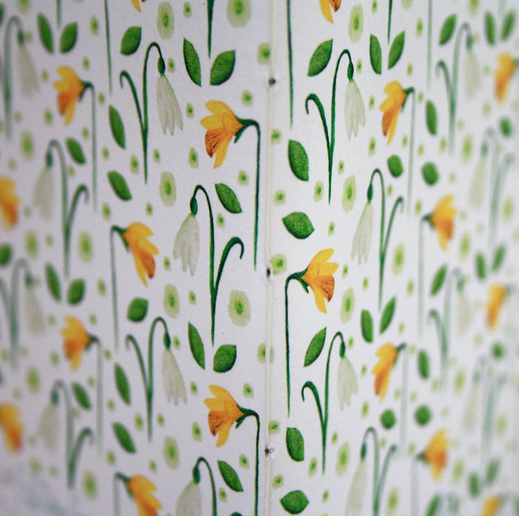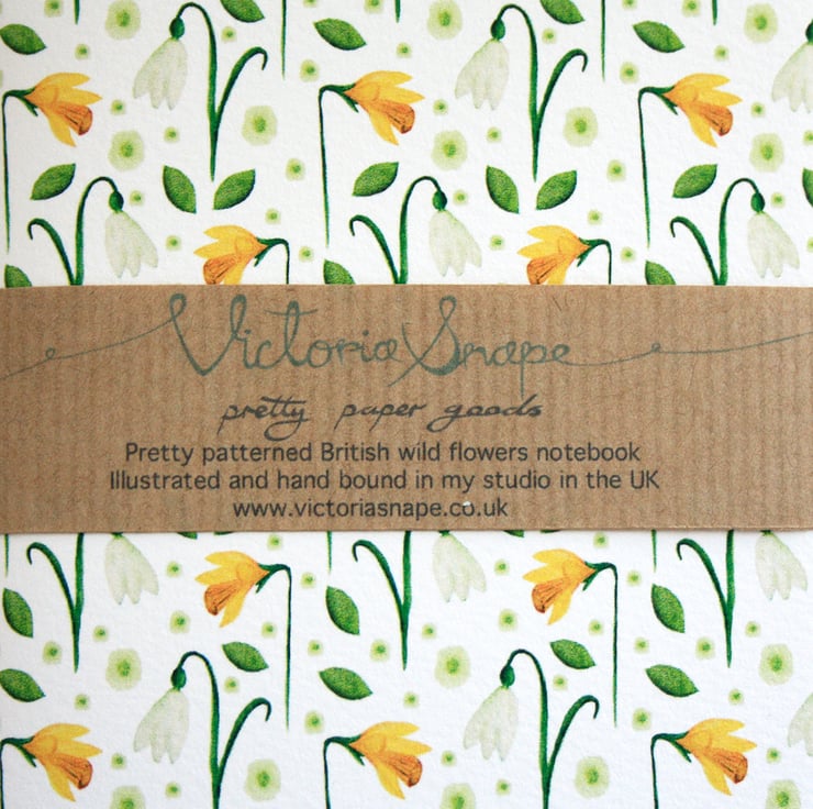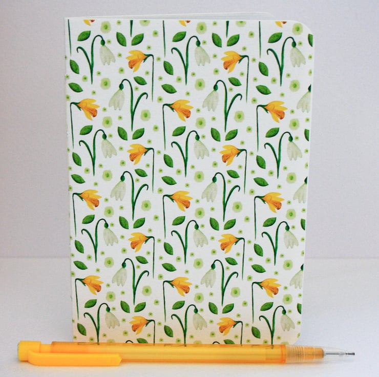 Pretty patterned small notebook featuring my original watercolour springtime, British wild flowers pattern, with spring flowers of snowdrops and daffodils to brighten up your day.