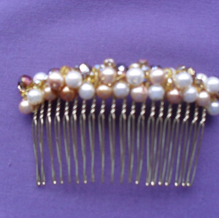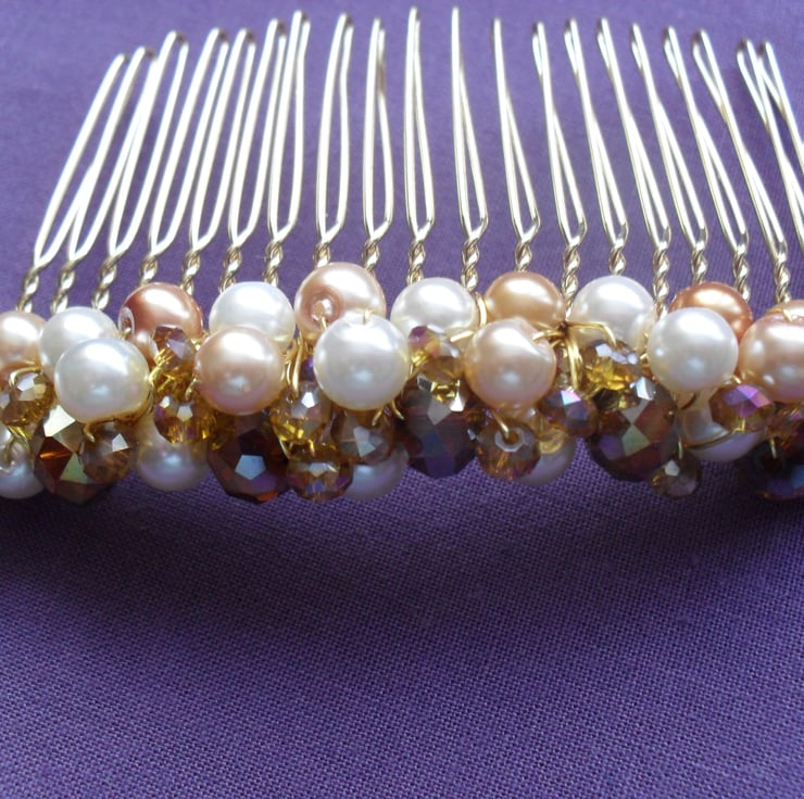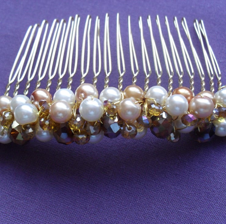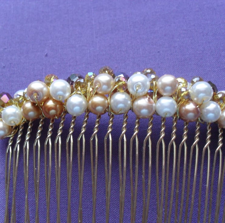 Gold and cream glass pearls 6 mm and crystals in tones of gold, are attached to a gold tone metal hair comb with gold tone wire.