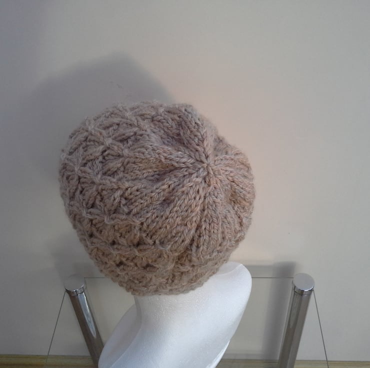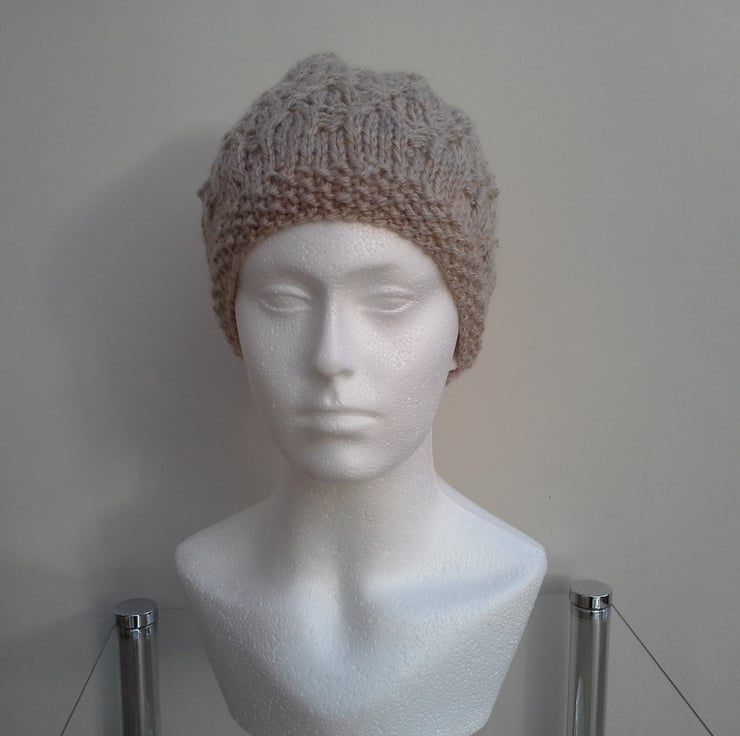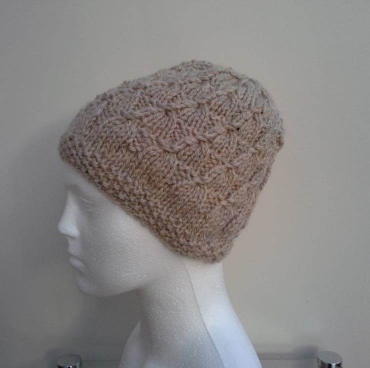 A nice warm beanie hat in a chunky yarn with 25% wool and 75% acrylic.
