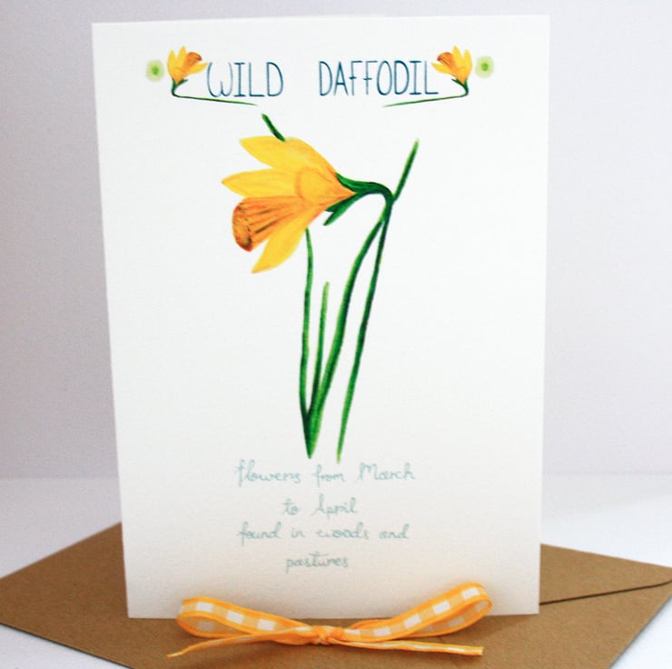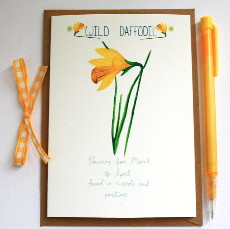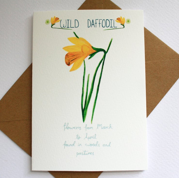 Simple and pretty card featuring my watercolour illustration of a Springtime Wild daffodil and hand lettering from my British wild flowers range.