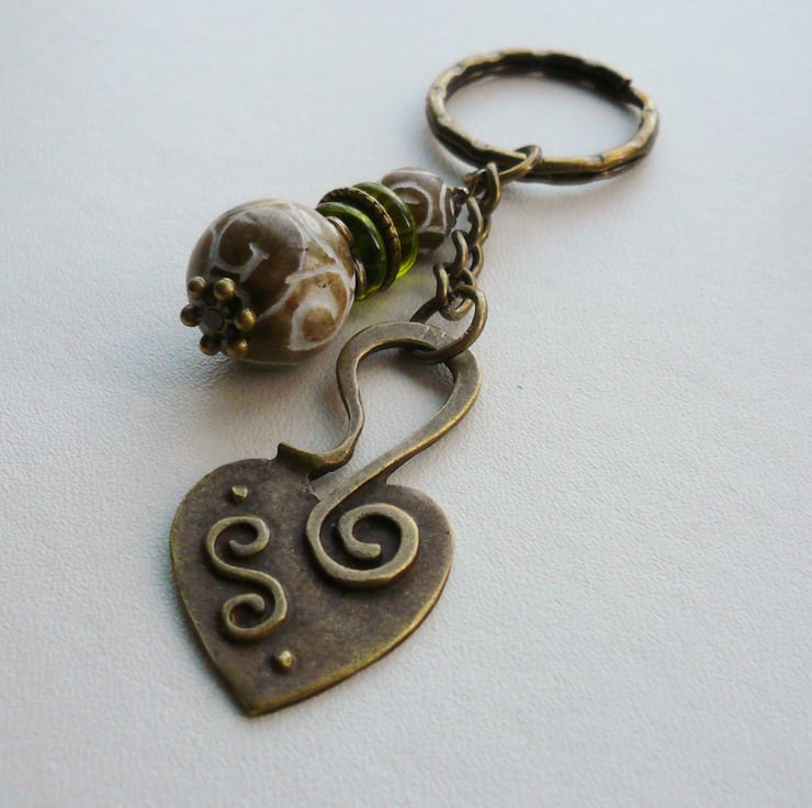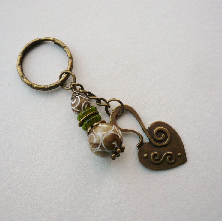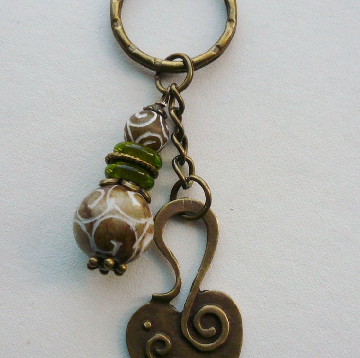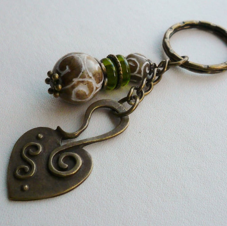 This keyring consists of 6mm and 14mm carved agate round beads separated with two green glass ring spacer beads, together with a 40mm long antique bronze heart pendant with co-ordinating swirl pattern. Bead caps and spacer disc are also antique bronze; All hung from an antique bronze key ring and chain.