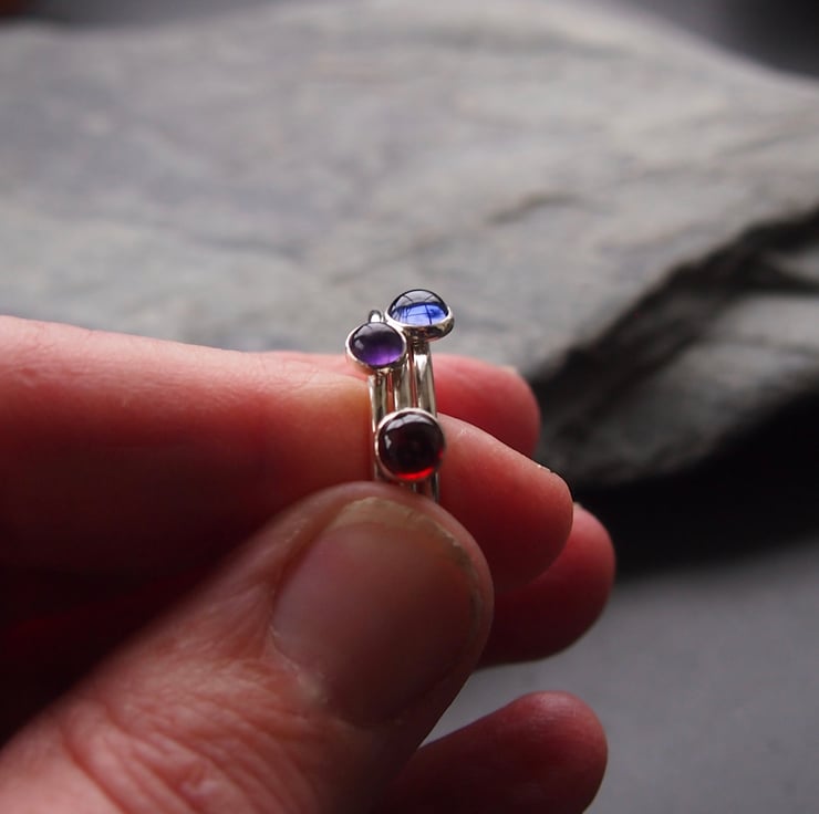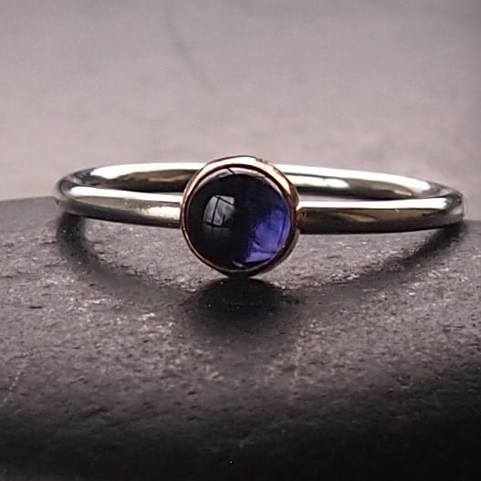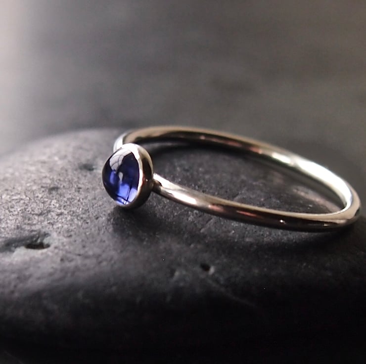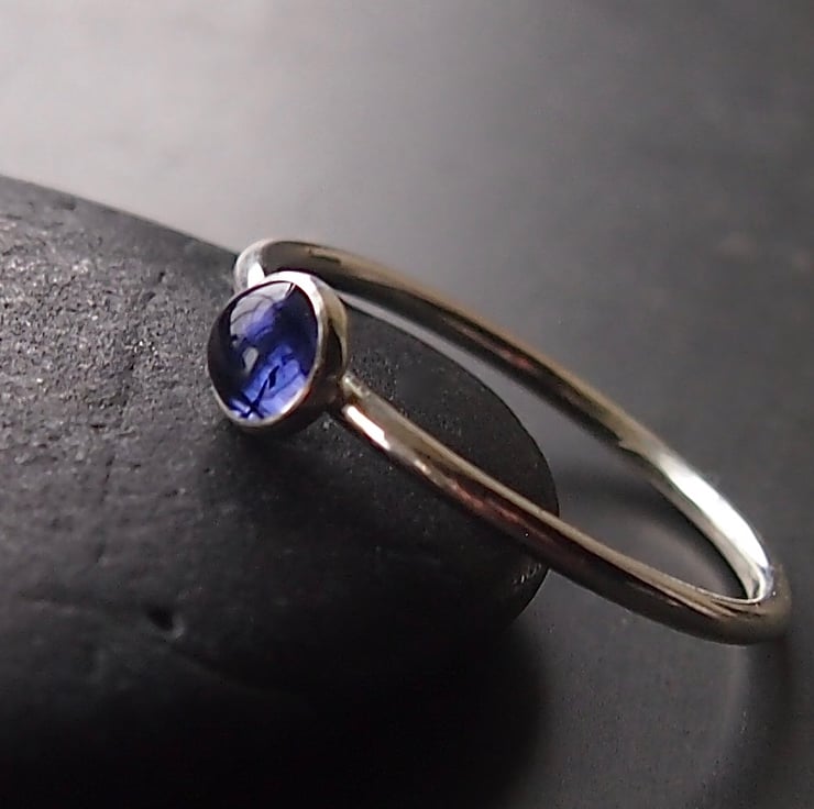 An inky blue 5mm iolite cabochon is simply set l onto a plain sterling silver ring 1.5 mm thick .