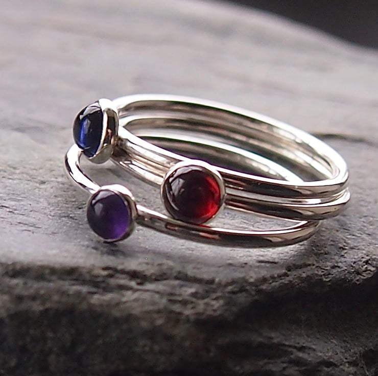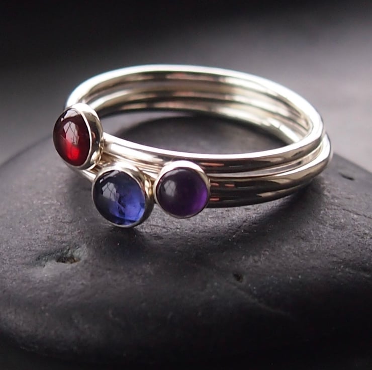 Three sterling silver rings stack together with iolite, garnet and amethyst on a 1.5 mm sterling silver band . They are simply set in sterling silver cups. Two of the cabochons are 5mm and the amethyst is slightly smaller at 4mm. If you would prefer them all the same size then please leave a message in the message to seller box at the checkout.