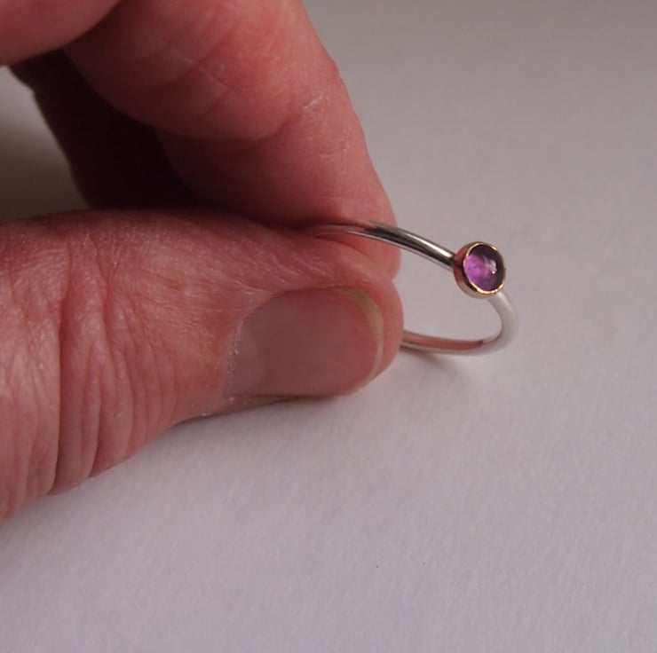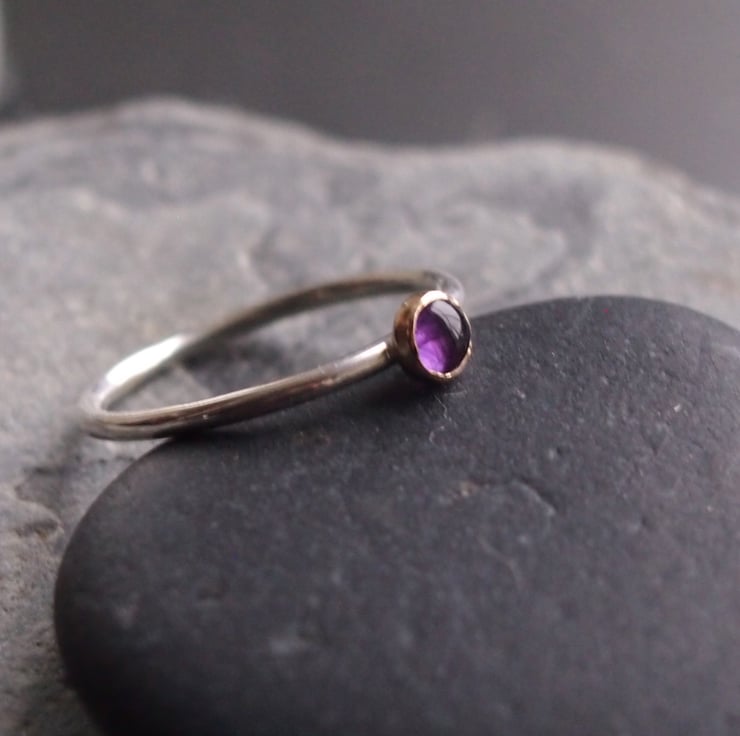 A purple 4mm amethyst cabochon is simply set in a gold fill bezel onto a plain sterling silver ring 1.5 mm thick .