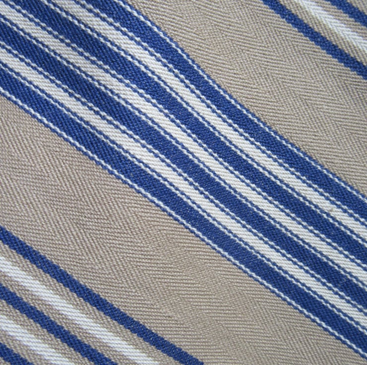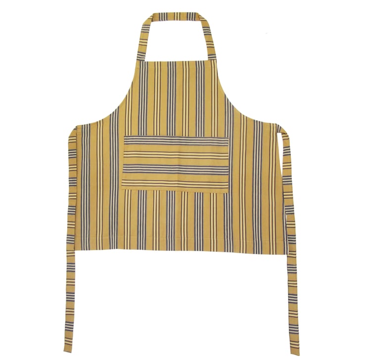 Womens traditional style apron, in a shorter length - made with lovely beige/blue, medium-weight, woven stripe cotton - it has an extra large pocket for bits and bobs.