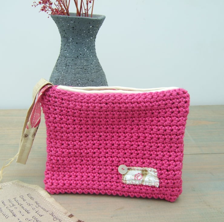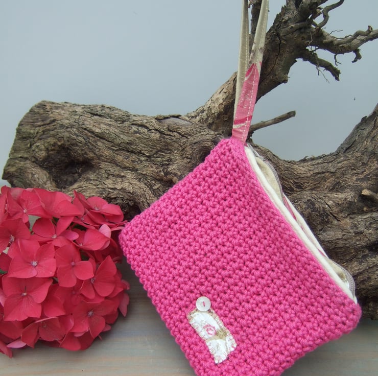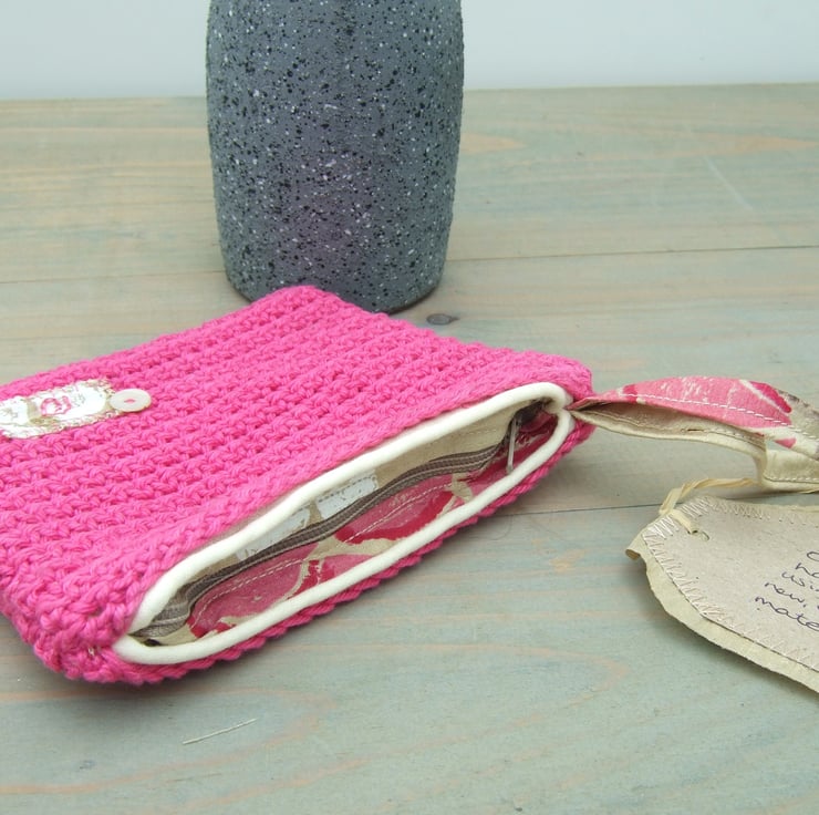 Handmade crocheted small purse with wrist strap and pearly button embellishment. This beautiful bag is my own design and handmade from natural materials; cotton yarn and silk fabric.