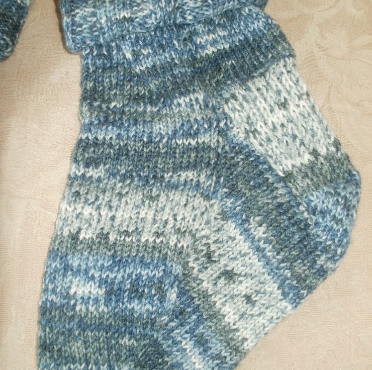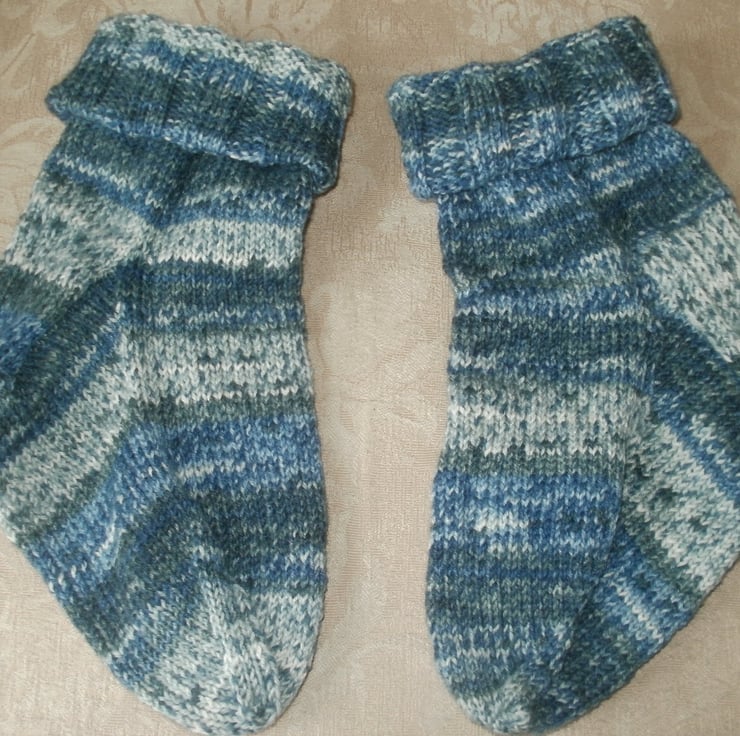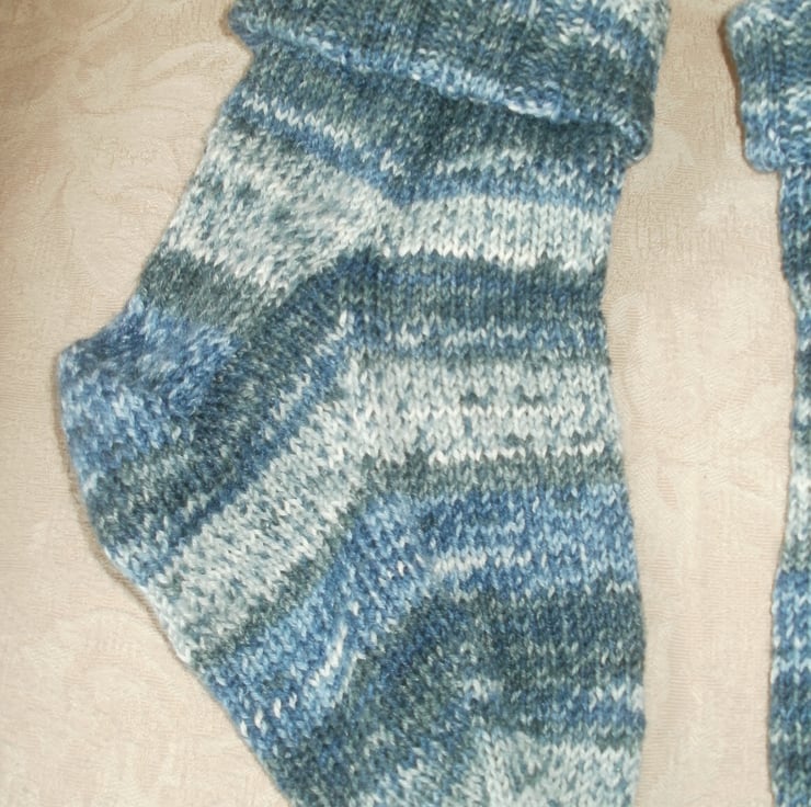 Lovely ankle length socks - knitted with a long cuff which makes them a bit slouchy. Ideal for anyone with circulation problems as there's no elastic to cut into you. Or just for lounging around in. Made on five needles, so no seams either. Fits up to a size 8 foot comfortably