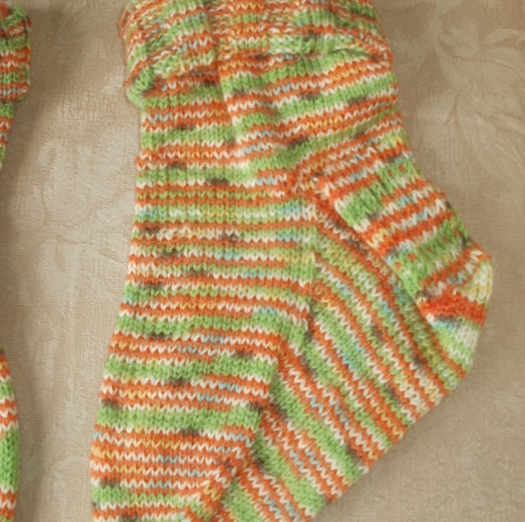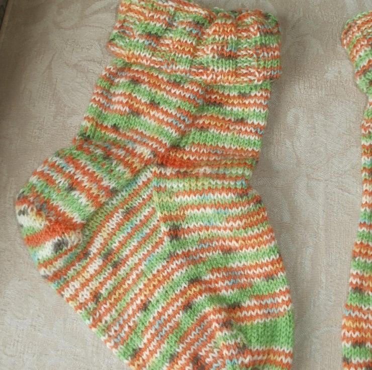 Lovely ankle length socks - knitted with a long cuff which makes them a bit slouchy. Ideal for anyone with circulation problems as there's no elastic to cut into you. Or just for lounging around in. Made on five needles, so no seams either. Fits up to a size 8 foot comfortably