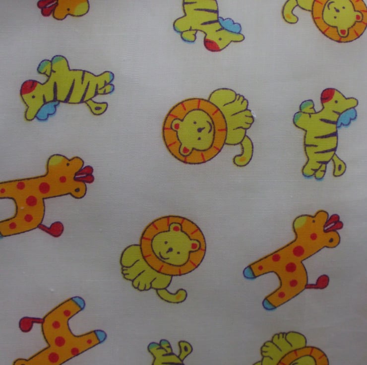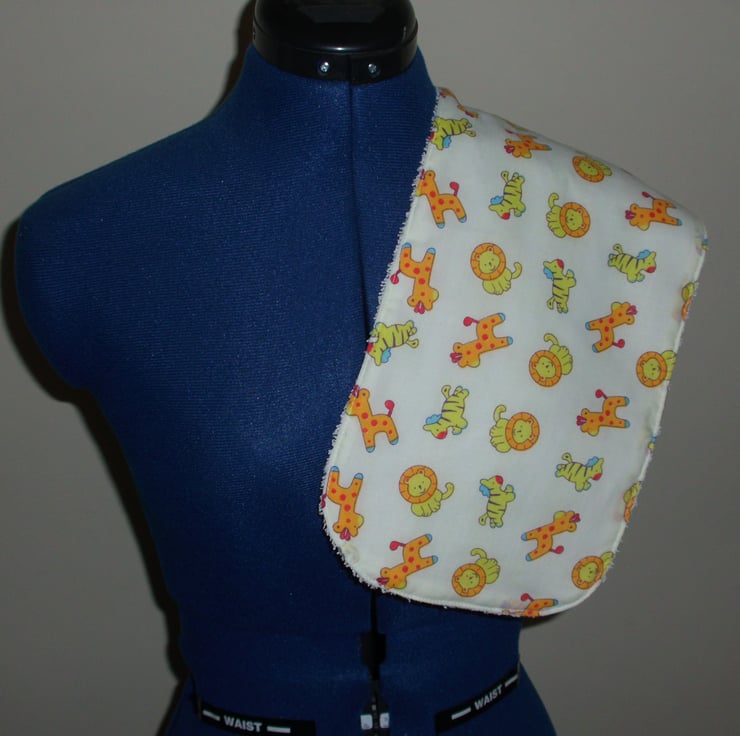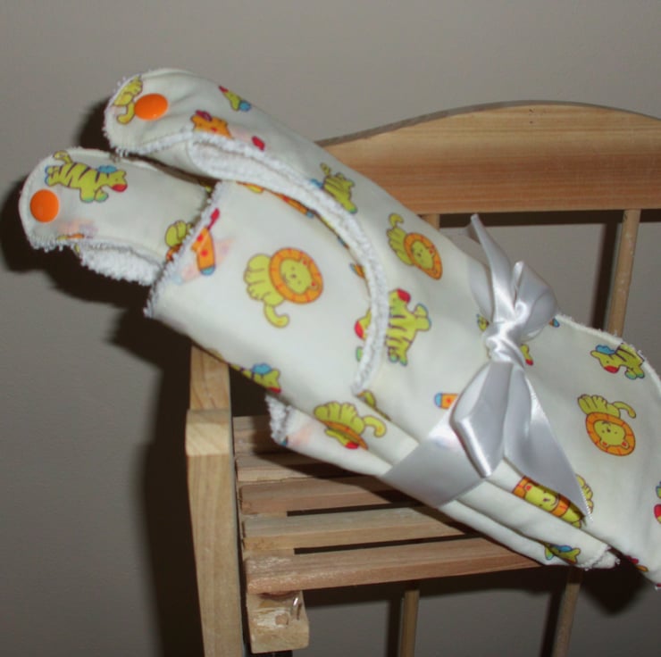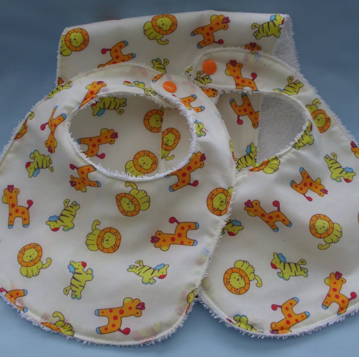 This set is two bibs and a burpping cloth the front is a cotton fabric with lions , zebras and giraffes.on a cream background it is cute and colourful. the back is a white terry toweling .They are all edged stitched . The bibs have orange poppers .