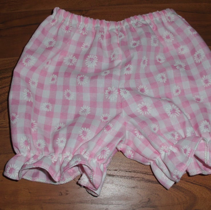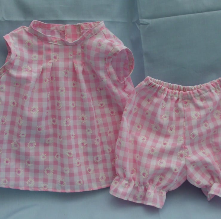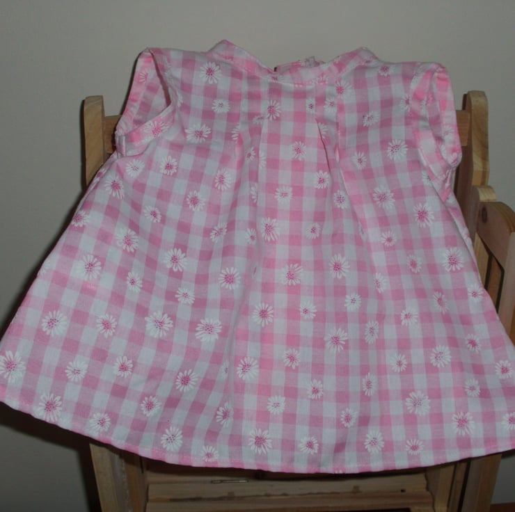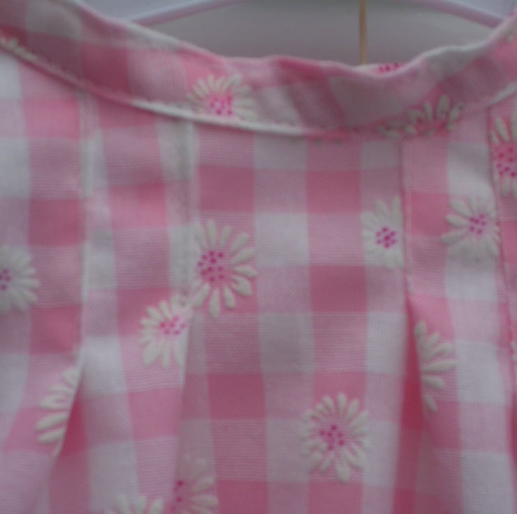 This set is made from a 100% cotton pink gingham with a white daisy print . The dress has four stitched down pleats on the front, arms and neck have been finished off with a bias from the same fabric and edged stiched. All seams have been over locked .