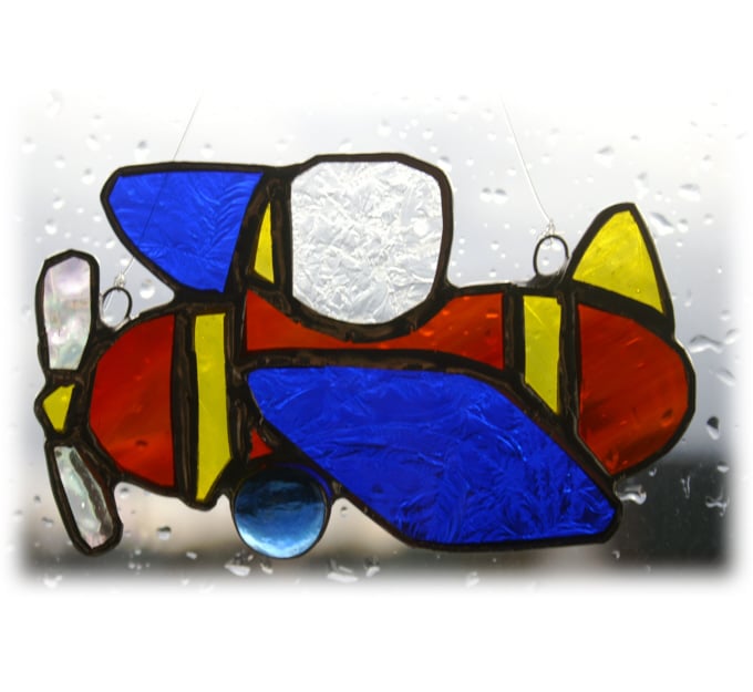 The window is made from frost patterned clear glass and the propeller is heavily textured iridescent. I have hung it from invisible thread rather than a chain so it gives a better impression of being in flight. It is about 5 inches long.