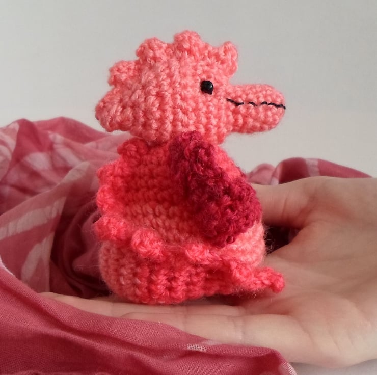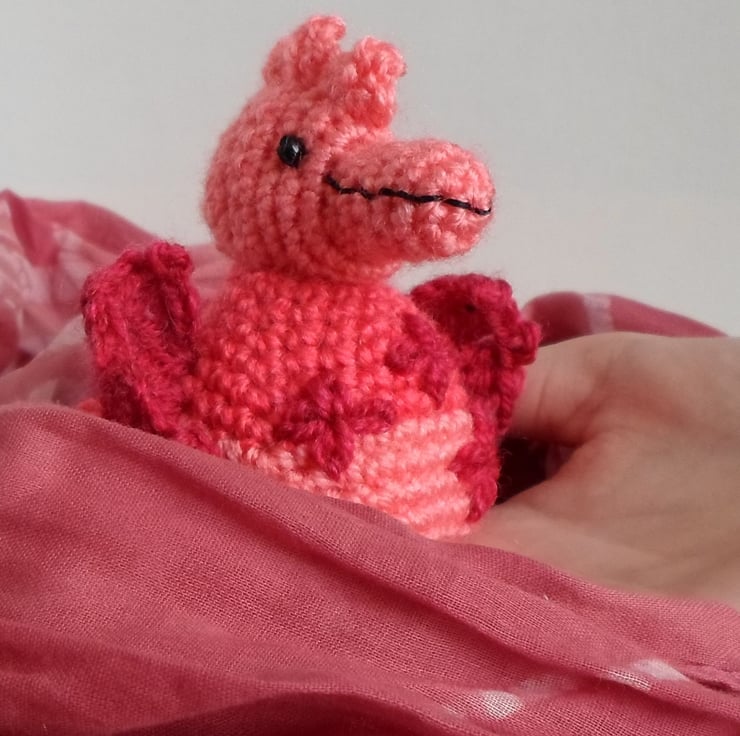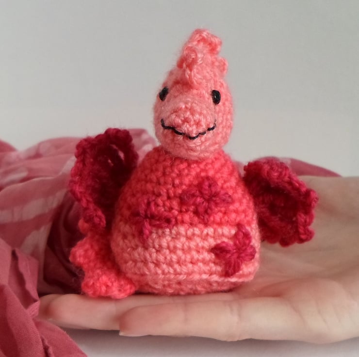 - She is crocheted from yarn, raspberry red is the main colour. The yarn changes tones, so each dragon is different. She has sewn flowers on her front. The mouth and nostrils are also sewn on. The eyes are black safety eyes.