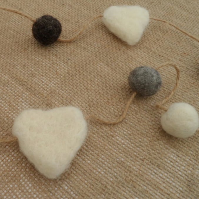 A pretty garland made from felted Corriedale woollen balls and needle felted hearts threaded onto jute twine.