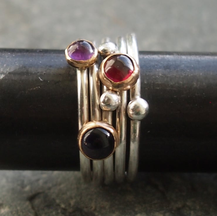 I'm constantly looking for ways to add different textures to the stacking ring collection. These work really well on their own or with other rings, especially the bezel set cabochons. Here they are shown with the summer berries trio.