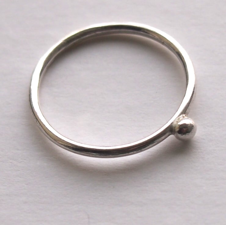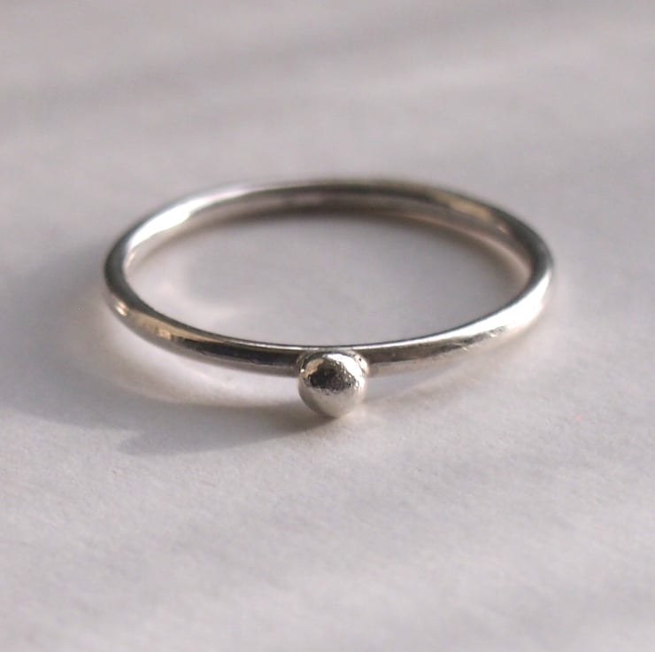A sterling silver 1.5mm band with one dot of silver soldered on to it. Wonderful on their own or great to stack.
